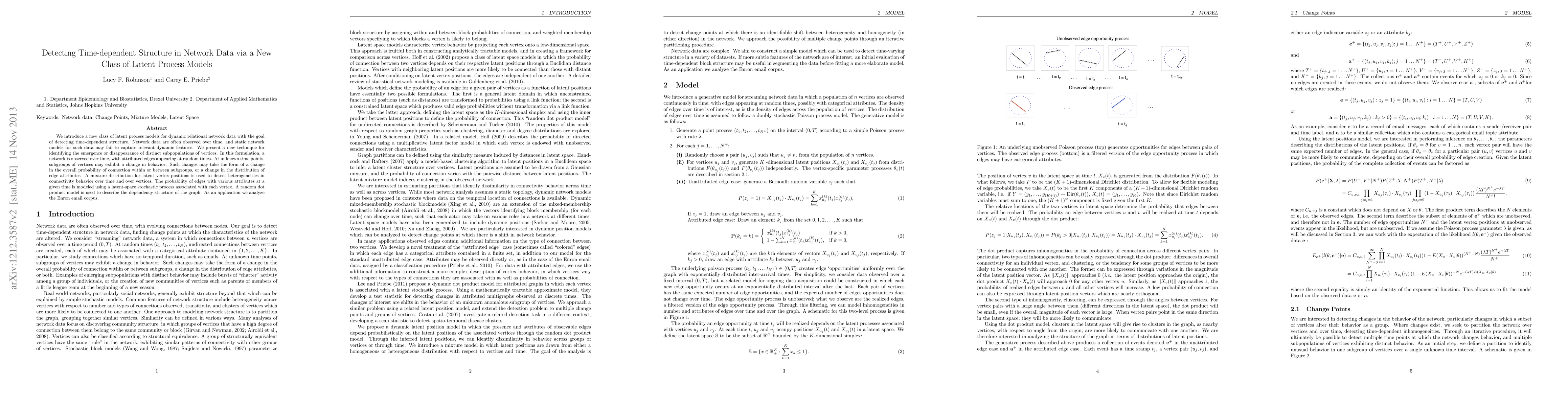 We introduce a new class of latent process models for dynamic relational network data with the goal of detecting time-dependent structure. Network data are often observed over time, and static network models for such data may fail to capture relevant dynamic features. We present a new technique for identifying the emergence or disappearance of distinct subpopulations of vertices. In this formulation, a network is observed over time, with attributed edges appearing at random times. At unknown time points, subgroups of vertices may exhibit a change in behavior. Such changes may take the form of a change in the overall probability of connection within or between subgroups, or a change in the distribution of edge attributes. A mixture distribution for latent vertex positions is used to detect heterogeneities in connectivity behavior over time and over vertices. The probability of edges with various attributes at a given time is modeled using a latent-space stochastic process associated with each vertex. A random dot product model is used to describe the dependency structure of the graph. As an application we analyze the Enron email corpus.