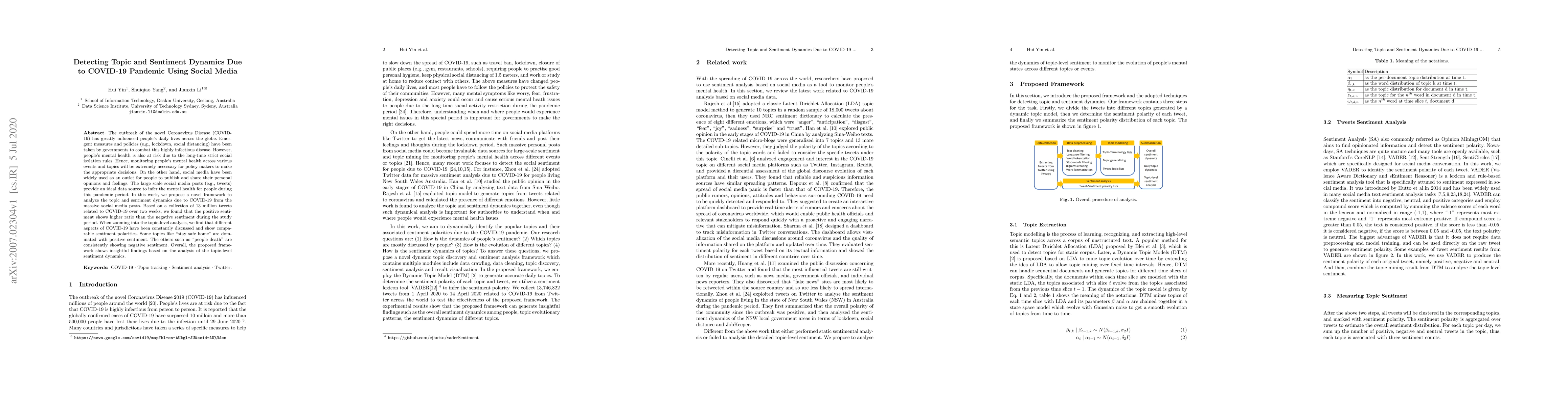 The outbreak of the novel Coronavirus Disease (COVID-19) has greatly influenced people's daily lives across the globe. Emergent measures and policies (e.g., lockdown, social distancing) have been taken by governments to combat this highly infectious disease. However, people's mental health is also at risk due to the long-time strict social isolation rules. Hence, monitoring people's mental health across various events and topics will be extremely necessary for policy makers to make the appropriate decisions. On the other hand, social media have been widely used as an outlet for people to publish and share their personal opinions and feelings. The large scale social media posts (e.g., tweets) provide an ideal data source to infer the mental health for people during this pandemic period. In this work, we propose a novel framework to analyze the topic and sentiment dynamics due to COVID-19 from the massive social media posts. Based on a collection of 13 million tweets related to COVID-19 over two weeks, we found that the positive sentiment shows higher ratio than the negative sentiment during the study period. When zooming into the topic-level analysis, we find that different aspects of COVID-19 have been constantly discussed and show comparable sentiment polarities. Some topics like ``stay safe home" are dominated with positive sentiment. The others such as ``people death" are consistently showing negative sentiment. Overall, the proposed framework shows insightful findings based on the analysis of the topic-level sentiment dynamics.