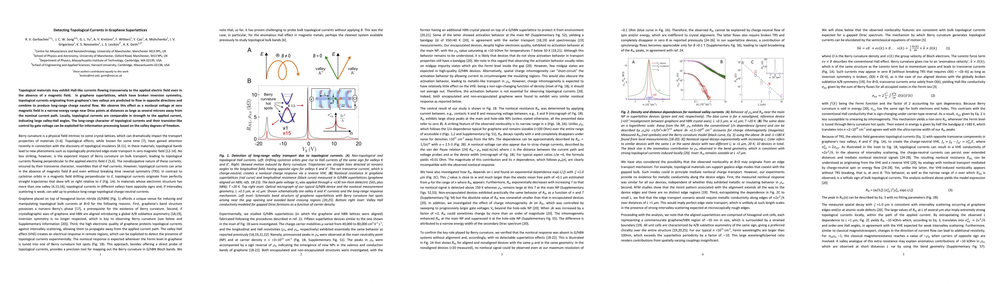 This study detects topological currents in graphene superlattices, revealing a nonlocal voltage near Dirac points without an external magnetic field. The currents, driven by valley-Hall effects, show long-range charge-neutral flow and are controllable via gate voltage, promising applications in valley-based information processing.