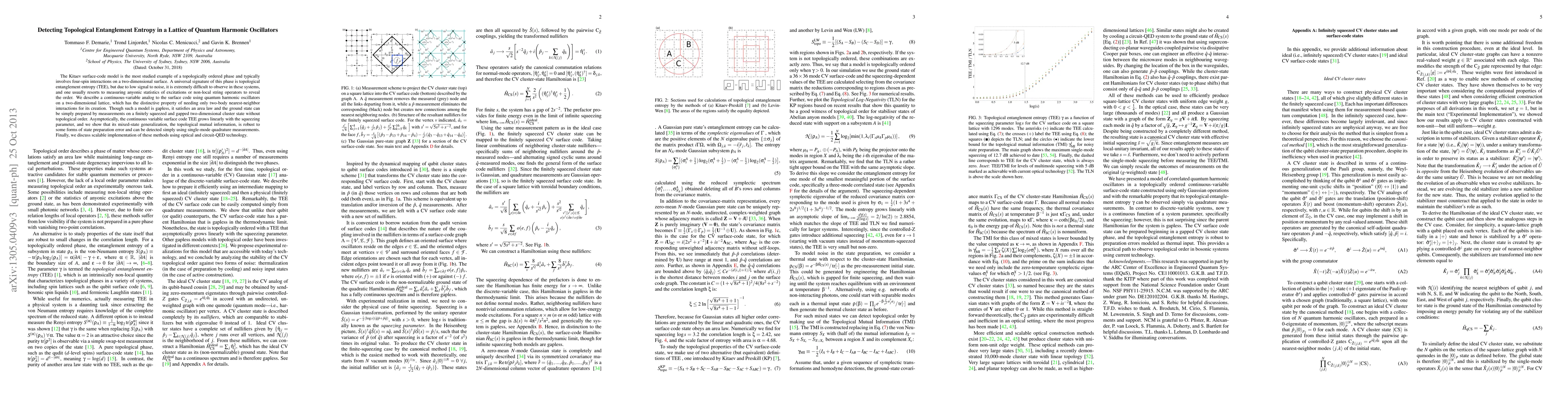 The Kitaev surface-code model is the most studied example of a topologically ordered phase and typically involves four-spin interactions on a two-dimensional surface. A universal signature of this phase is topological entanglement entropy (TEE), but due to low signal to noise, it is extremely difficult to observe in these systems, and one usually resorts to measuring anyonic statistics of excitations or non-local string operators to reveal the order. We describe a continuous-variable analog to the surface code using quantum harmonic oscillators on a two-dimensional lattice, which has the distinctive property of needing only two-body nearest-neighbor interactions for its creation. Though such a model is gapless, satisfies an area law, and the ground state can be simply prepared by measurements on a finitely squeezed and gapped two-dimensional cluster state, which does not have topological order. Asymptotically, the TEE grows linearly with the squeezing parameter, and we show that its mixed-state generalization, the topological mutual information, is robust to some forms of state preparation error and can be detected simply using single-mode quadrature measurements. Finally, we discuss scalable implementation of these methods using optical and circuit-QED technology.