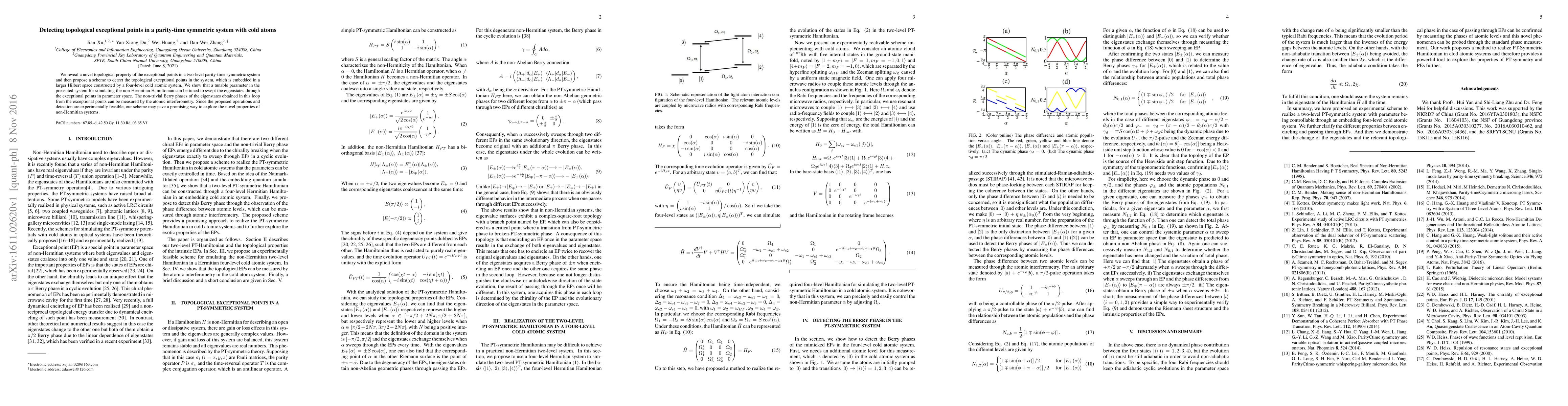 This paper introduces a novel topological property of exceptional points in a parity-time symmetric system using cold atoms, and proposes a method to detect these points by tuning a parameter to sweep through exceptional points and measuring non-trivial Berry phases via atomic interferometry. The feasibility of the proposed scheme suggests a promising approach to explore non-Hermitian systems.