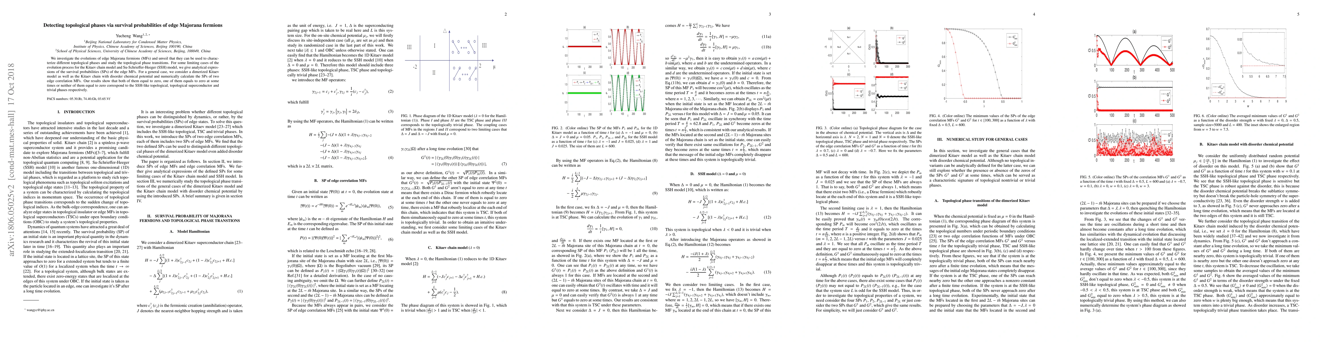 This paper explores the use of edge Majorana fermions' survival probabilities to identify topological phases and transitions in the Kitaev and SSH models. Analytical expressions for specific cases reveal that distinct topological phases correspond to different zero point numbers in survival probabilities, while numerical analysis of more general models confirms these findings.