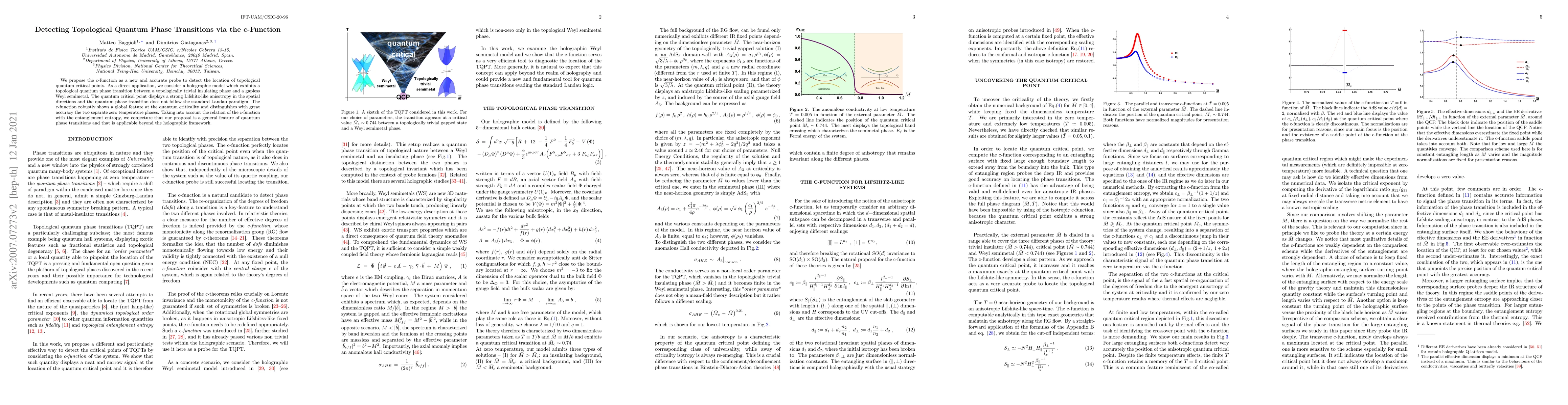 The paper introduces the c-function as a tool to detect topological quantum phase transitions, applying it to a holographic model with a transition from an insulator to a Weyl semimetal. The c-function accurately pinpoints the critical point, which lacks typical Landau theory characteristics, and suggests this method could be generalizable beyond holography.