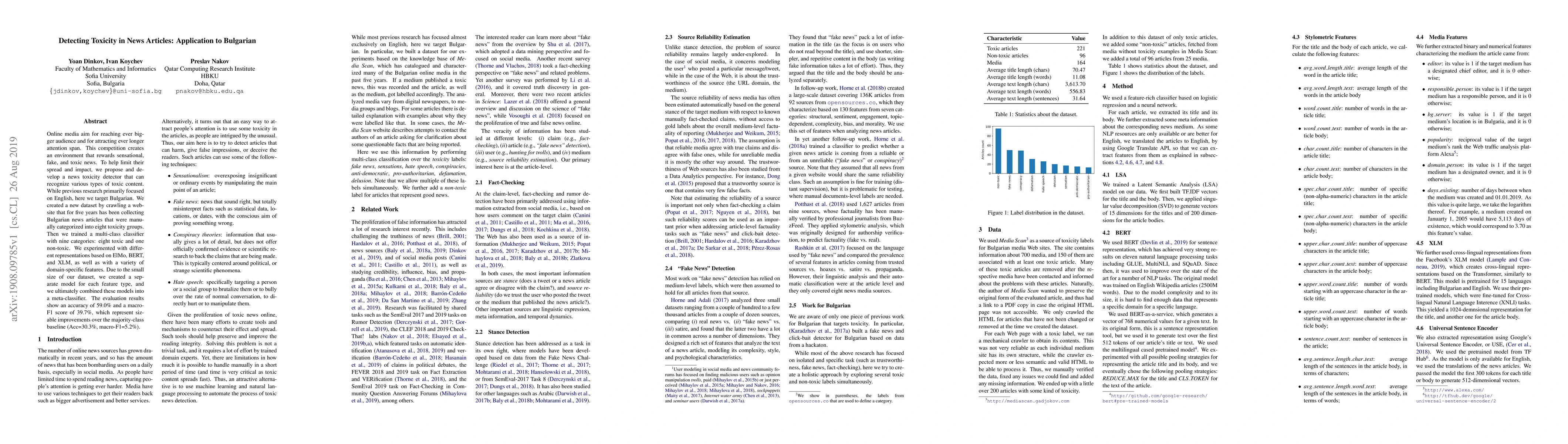 A new news toxicity detector was developed to recognize toxic content in Bulgarian news articles, achieving an accuracy of 59.0% and a macro-F1 score of 39.7%. The model outperformed the majority-class baseline, showing sizable improvements.