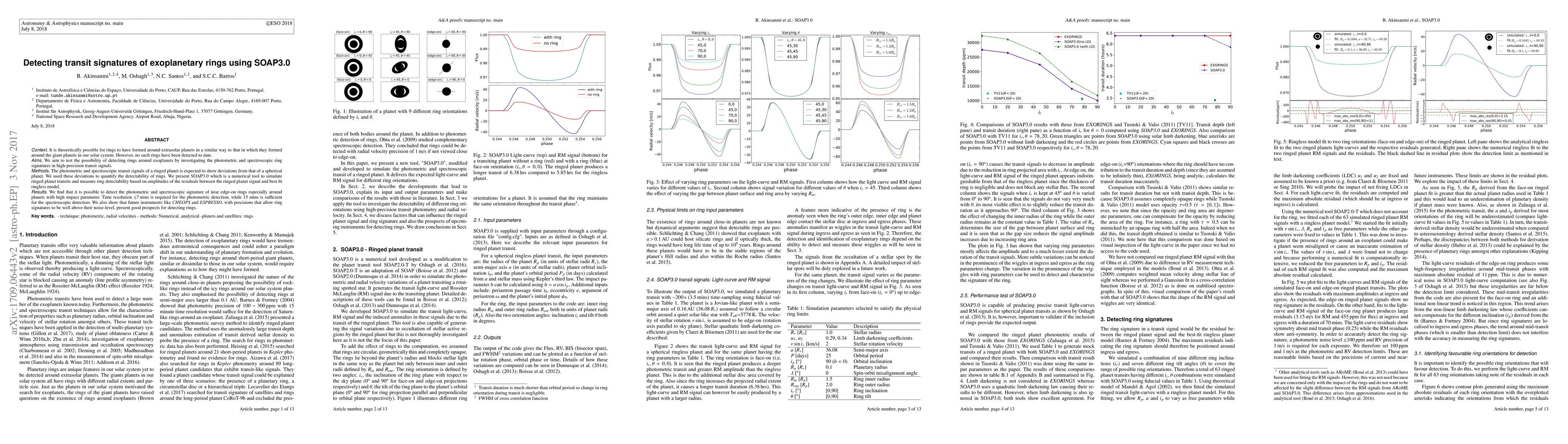 This paper explores the possibility of detecting rings around exoplanets using SOAP3.0, a tool to simulate transit signals. The study finds that near edge-on rings, especially around planets with high impact parameters, can be detected photometrically with time resolution ≤ 7 mins and spectroscopically with 15 mins, suggesting future instruments like CHEOPS and ESPRESSO could successfully identify such signatures.
