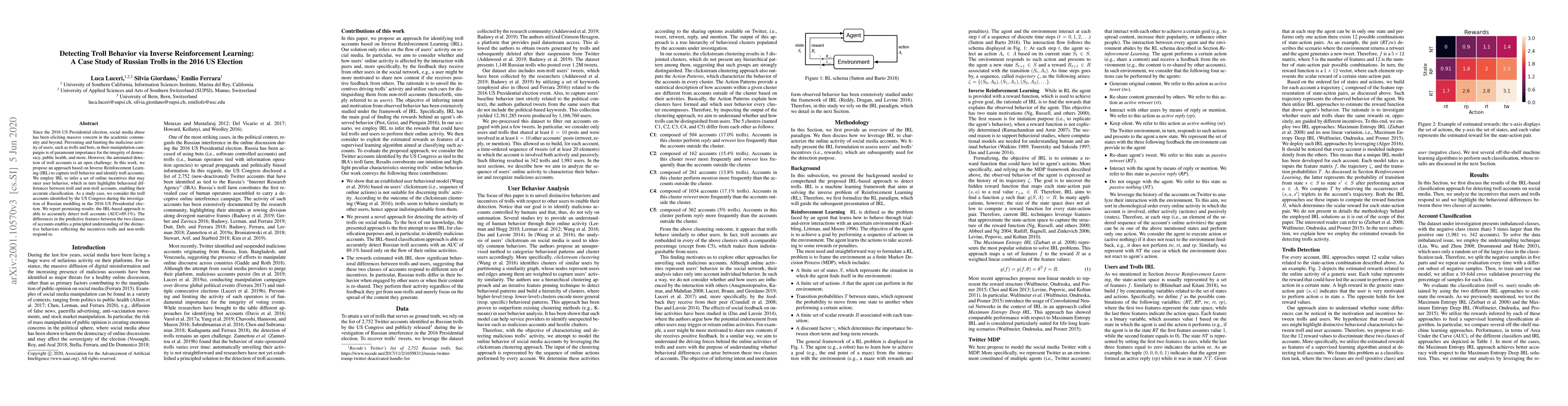 This paper proposes an Inverse Reinforcement Learning (IRL) approach to detect troll behavior, specifically focusing on Russian troll accounts involved in the 2016 US election. The method successfully identifies trolls with an AUC of 89.1%, revealing distinct behavioral incentives that differentiate troll and non-troll accounts.