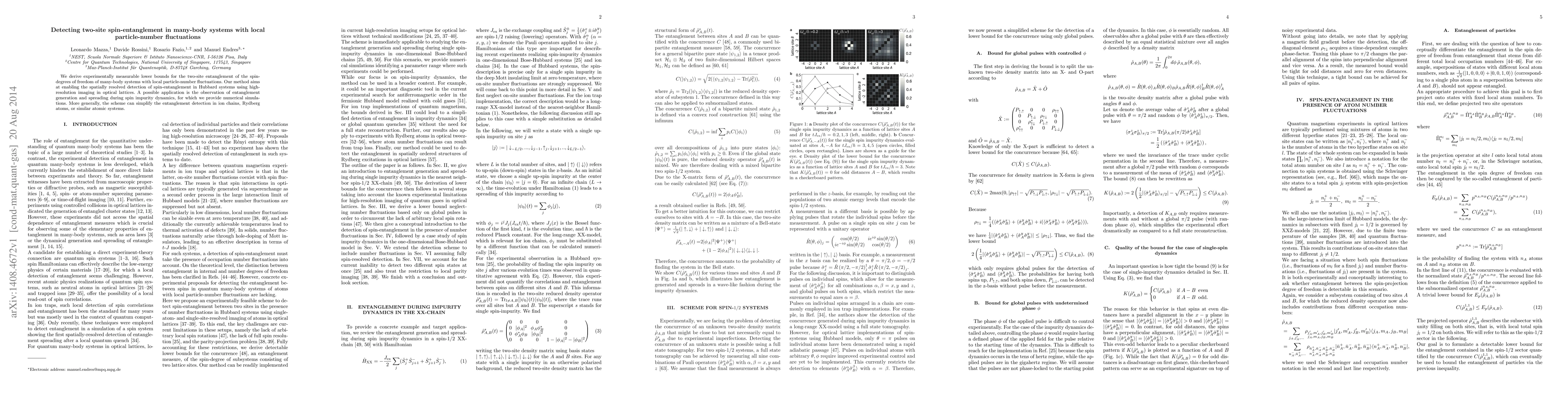 This paper proposes a method to detect two-site spin-entanglement in many-body systems using local particle-number fluctuations, enabling spatially resolved detection in optical lattices. The approach is demonstrated through numerical simulations for Hubbard systems and can be applied to ion chains and Rydberg atoms.