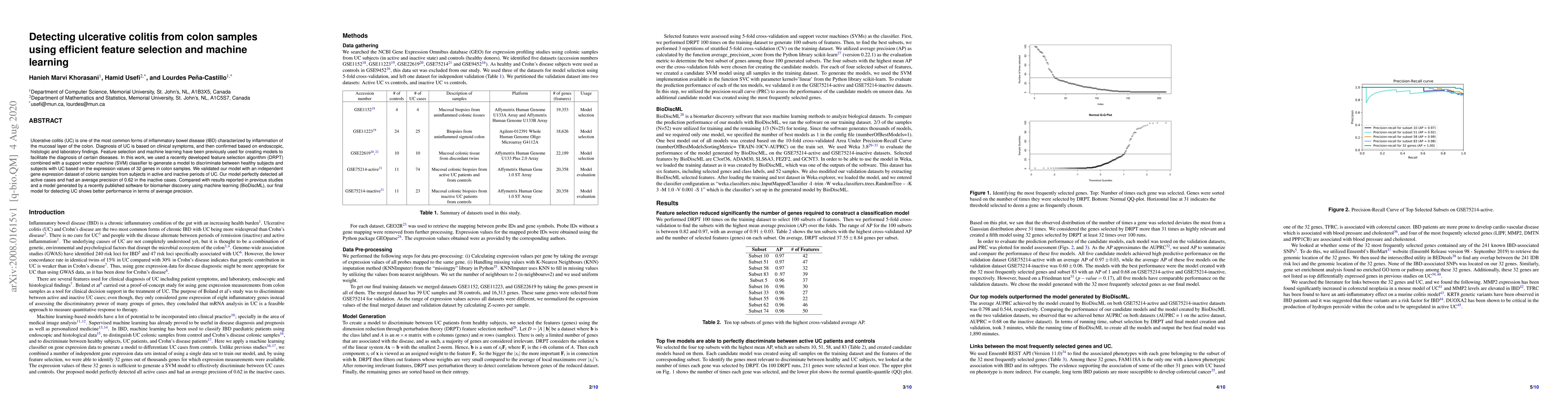 This study developed a model using a feature selection algorithm (DRPT) and SVM classifier to detect ulcerative colitis from colon samples based on gene expression data, achieving perfect detection of active cases and improved average precision compared to previous methods.