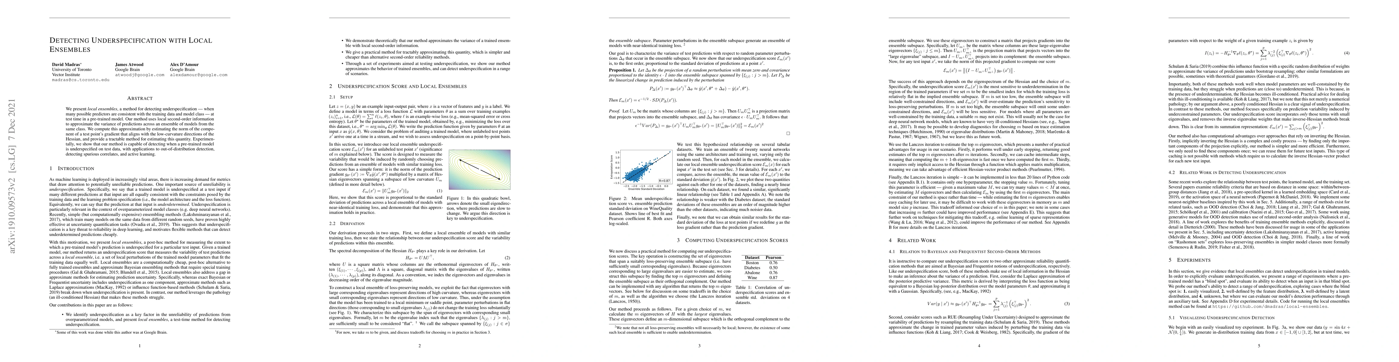 The paper introduces a method called local ensembles for detecting underspecification in pre-trained models, using second-order information to approximate the variance of predictions across ensemble models from the same class.