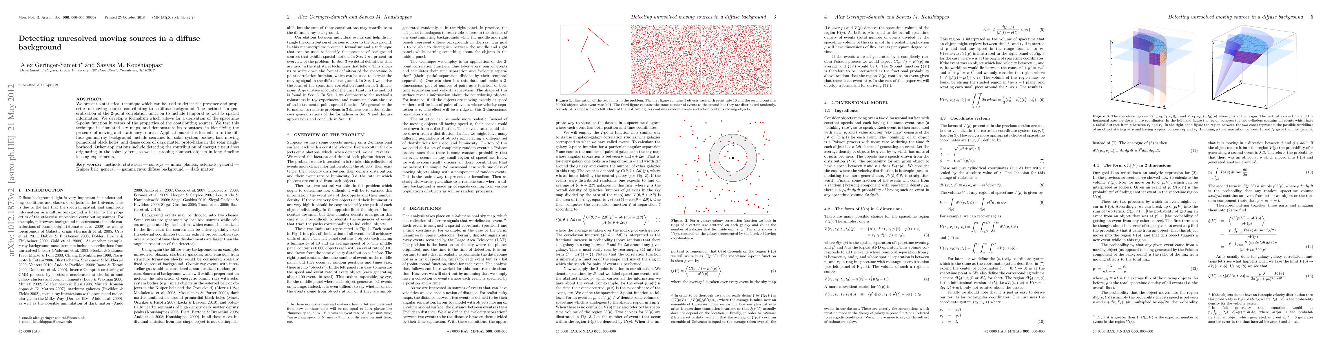 The research presents a statistical technique generalizing the 2-point correlation function to include temporal information, allowing for the detection of moving sources in a diffuse background through a spacetime 2-point function formalism.