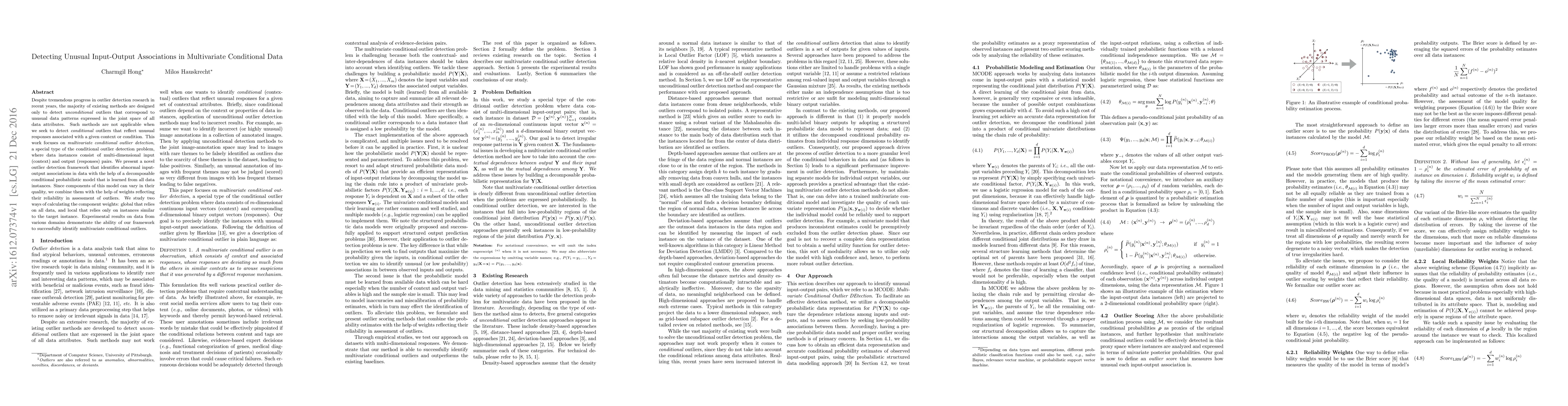 This paper introduces a novel framework for detecting multivariate conditional outliers by identifying unusual input-output associations in data. It employs a decomposable conditional probabilistic model, combining global and local weight strategies to assess outlier reliability, and demonstrates effectiveness through experiments across various domains.