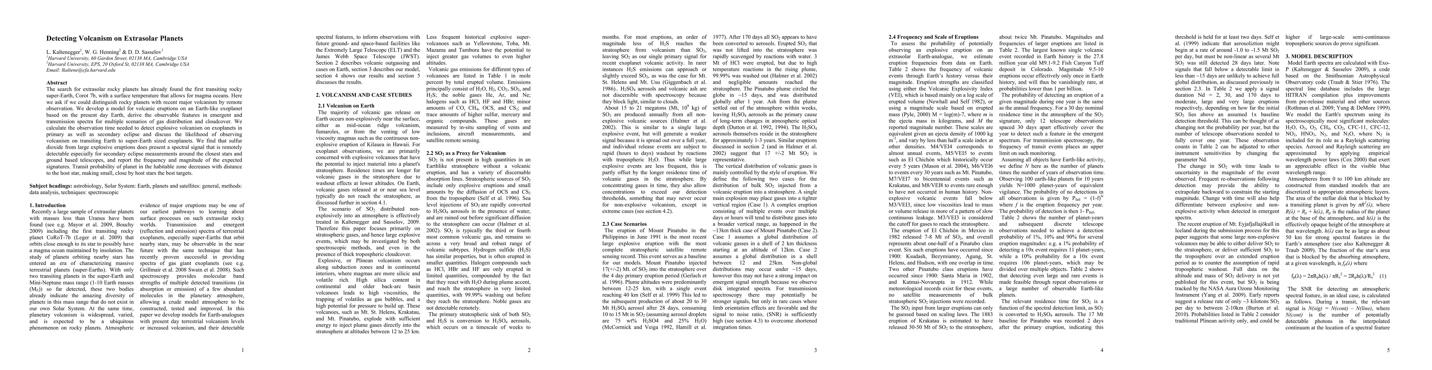 This paper develops a model to detect volcanic activity on Earth-like exoplanets by analyzing spectral signatures, particularly sulfur dioxide from explosive eruptions, and concludes that secondary eclipse observations around nearby stars using ground-based telescopes offer the best chance for detection. It finds that closer, smaller host stars are optimal targets due to the transit probability decrease with distance.