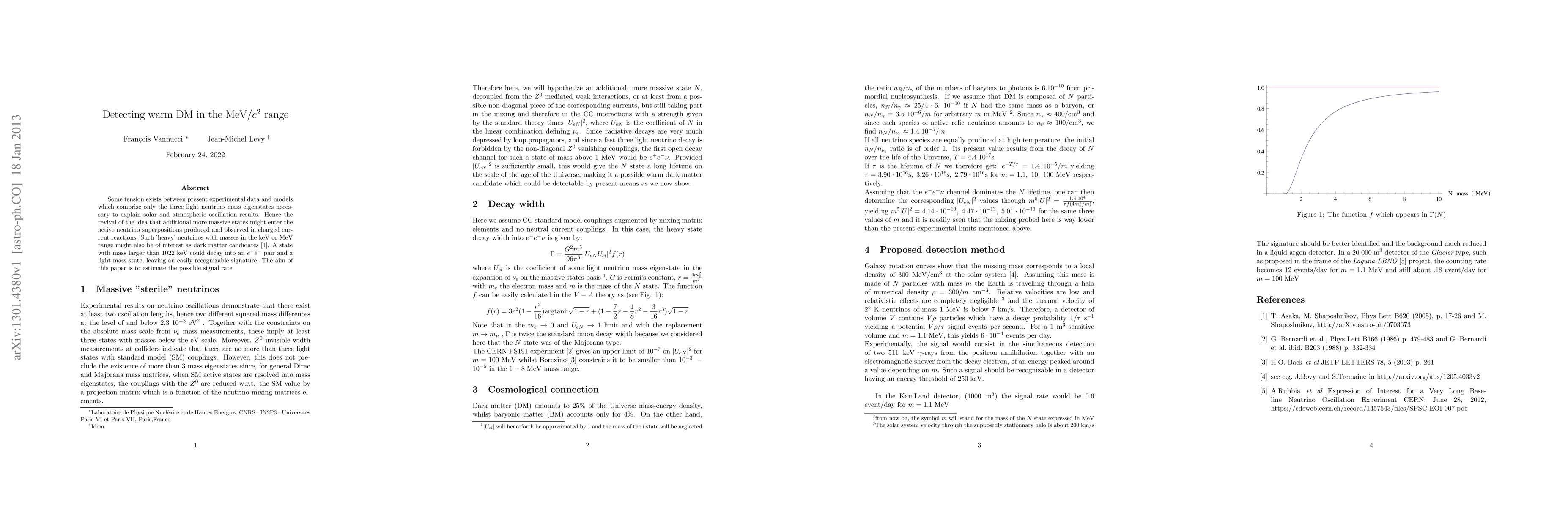 Some tension exists between present experimental data and models which comprise only the three light neutrino mass eigenstates necessary to explain solar and atmospheric oscillation results. Hence the revival of the idea that additional more massive states might enter the active neutrino superpositions produced and observed in charged current reactions. Such 'heavy' neutrinos with masses in the keV or MeV range might also be of interest as dark matter candidates. A state with mass larger than 1022 keV could decay into an $e^+ e^-$ pair and a light mass state, leaving an easily recognizable signature. The aim of this paper is to estimate the possible signal rate.