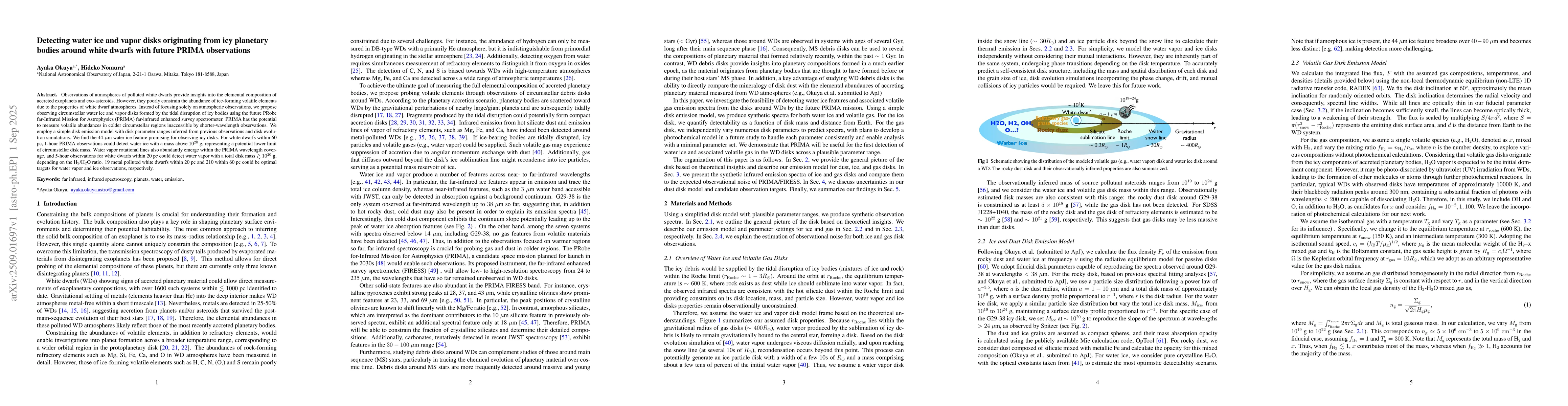 Observations of atmospheres of polluted white dwarfs provide insights into the elemental composition of accreted exoplanets and exo-asteroids. However, they poorly constrain the abundance of ice-forming volatile elements due to the properties of white dwarf atmospheres. Instead of focusing solely on atmospheric observations, we propose observing circumstellar water ice and vapor disks formed by the tidal disruption of icy bodies using the future PRobe far-Infrared Mission for Astrophysics (PRIMA) far-infrared enhanced survey spectrometer. PRIMA has the potential to measure volatile abundances in colder circumstellar regions inaccessible by shorter-wavelength observations. We employ a simple disk emission model with disk parameter ranges inferred from previous observations and disk evolution simulations. We find the 44-$\mu$m water ice feature promising for observing icy disks. For white dwarfs within 60 pc, 1-hour PRIMA observations could detect water ice with a mass above $10^{20}$ g, representing a potential lower limit of circumstellar disk mass. Water vapor rotational lines also abundantly emerge within the PRIMA wavelength coverage, and 5-hour observations for white dwarfs within 20 pc could detect water vapor with a total disk mass $\gtrsim 10^{20}$ g, depending on the H$_2$/H$_2$O ratio. 19 metal polluted white dwarfs within 20 pc and 210 within 60 pc could be optimal targets for water vapor and ice observations, respectively.