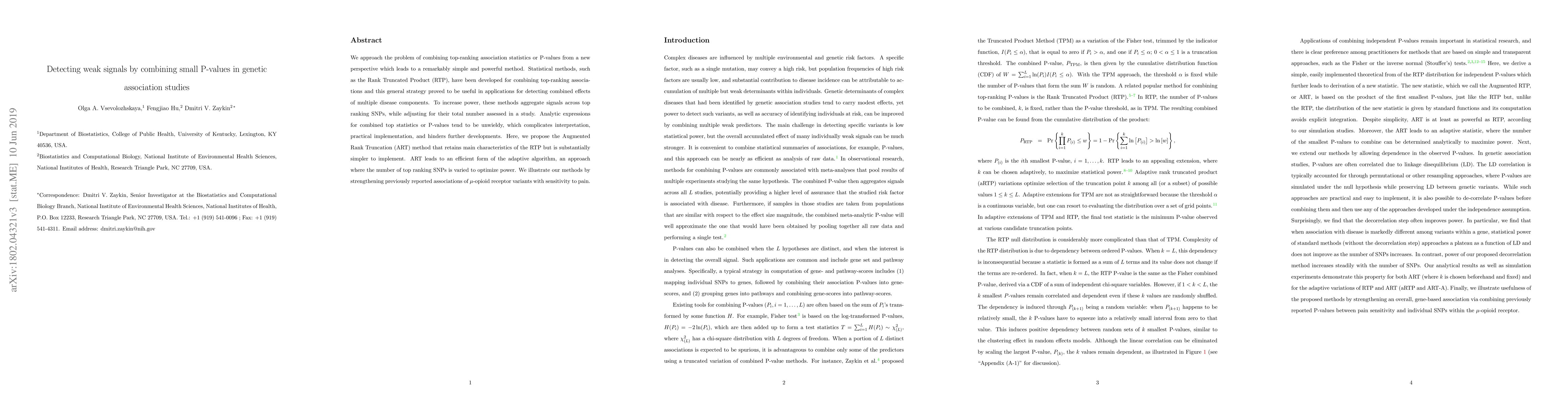 We approach the problem of combining top-ranking association statistics or P-value from a new perspective which leads to a remarkably simple and powerful method. Statistical methods, such as the Rank Truncated Product (RTP), have been developed for combining top-ranking associations and this general strategy proved to be useful in applications for detecting combined effects of multiple disease components. To increase power, these methods aggregate signals across top ranking SNPs, while adjusting for their total number assessed in a study. Analytic expressions for combined top statistics or P-values tend to be unwieldy, which complicates interpretation, practical implementation, and hinders further developments. Here, we propose the Augmented Rank Truncation (ART) method that retains main characteristics of the RTP but is substantially simpler to implement. ART leads to an efficient form of the adaptive algorithm, an approach where the number of top ranking SNPs is varied to optimize power. We illustrate our methods by strengthening previously reported associations of $\mu$-opioid receptor variants with sensitivity to pain.