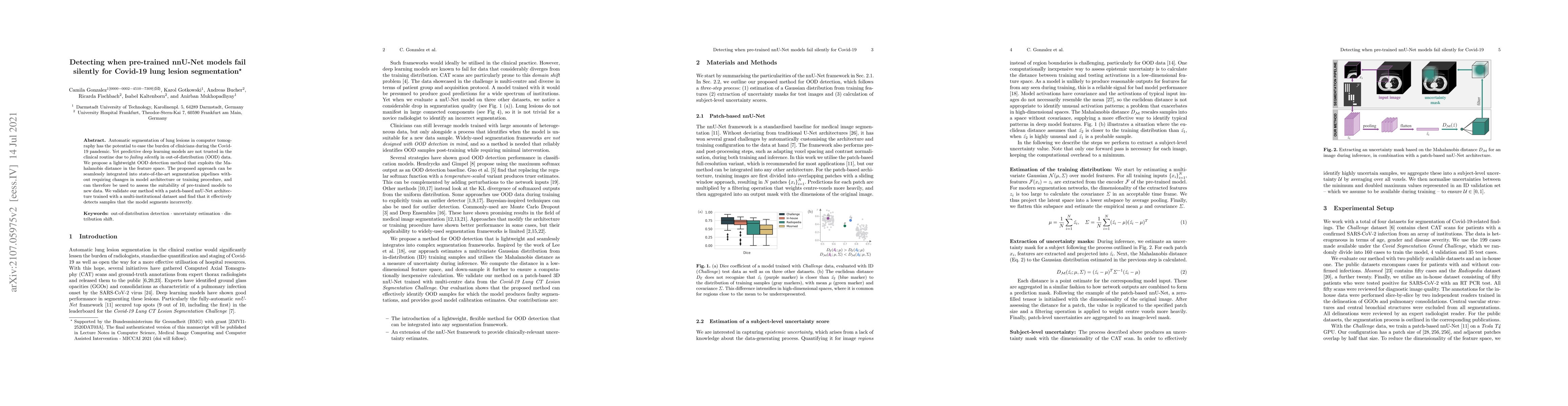 Automatic segmentation of lung lesions in computer tomography has the potential to ease the burden of clinicians during the Covid-19 pandemic. Yet predictive deep learning models are not trusted in the clinical routine due to failing silently in out-of-distribution (OOD) data. We propose a lightweight OOD detection method that exploits the Mahalanobis distance in the feature space. The proposed approach can be seamlessly integrated into state-of-the-art segmentation pipelines without requiring changes in model architecture or training procedure, and can therefore be used to assess the suitability of pre-trained models to new data. We validate our method with a patch-based nnU-Net architecture trained with a multi-institutional dataset and find that it effectively detects samples that the model segments incorrectly.