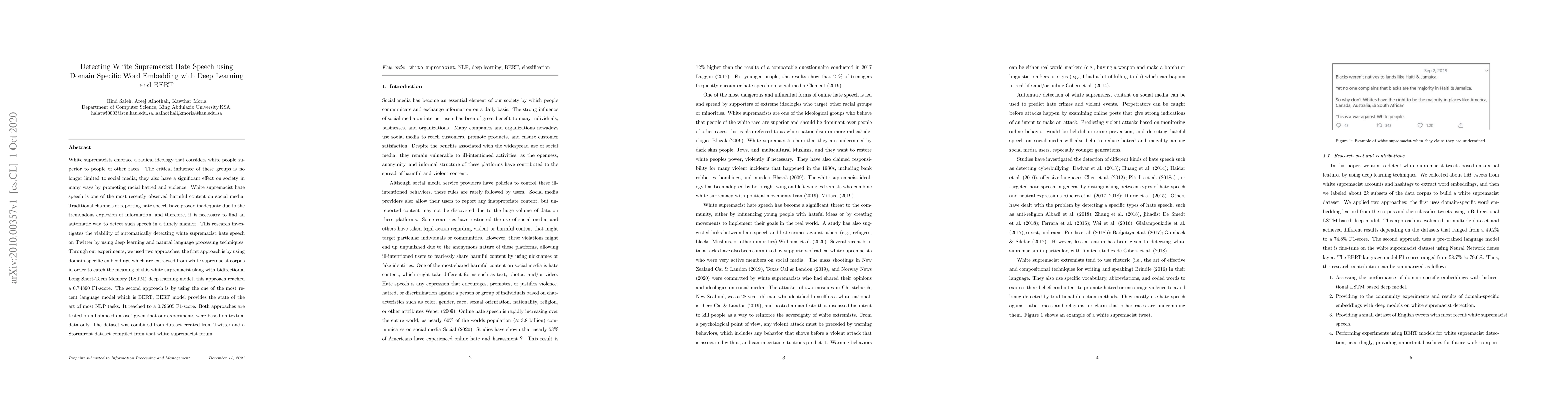 This research explores the automatic detection of white supremacist hate speech on Twitter using deep learning and natural language processing techniques. The study compares two methods: one using domain-specific embeddings with LSTM achieving an F1-score of 0.74890, and another using BERT achieving an F1-score of 0.79605, demonstrating BERT's superior performance.