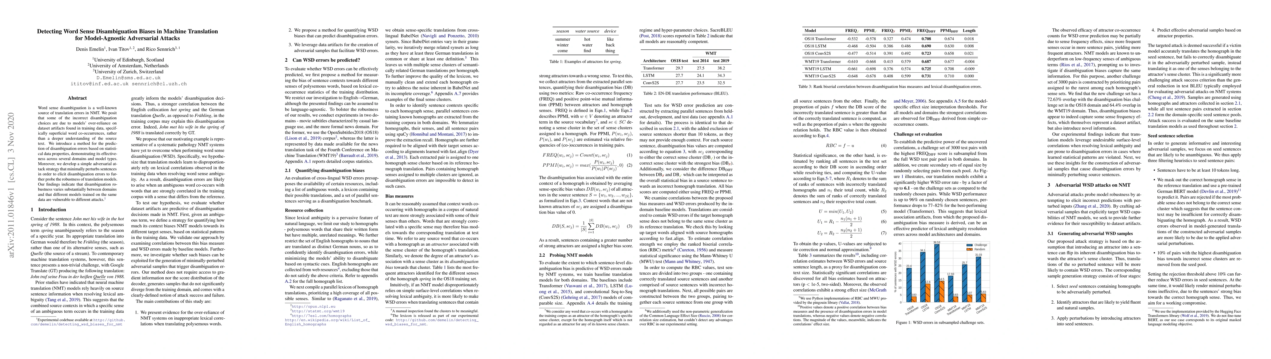 This paper proposes a method to detect word sense disambiguation biases in neural machine translation models, attributing errors to over-reliance on training data artifacts. It introduces an adversarial attack strategy to probe model robustness, revealing significant domain-specific variations in disambiguation error susceptibility.