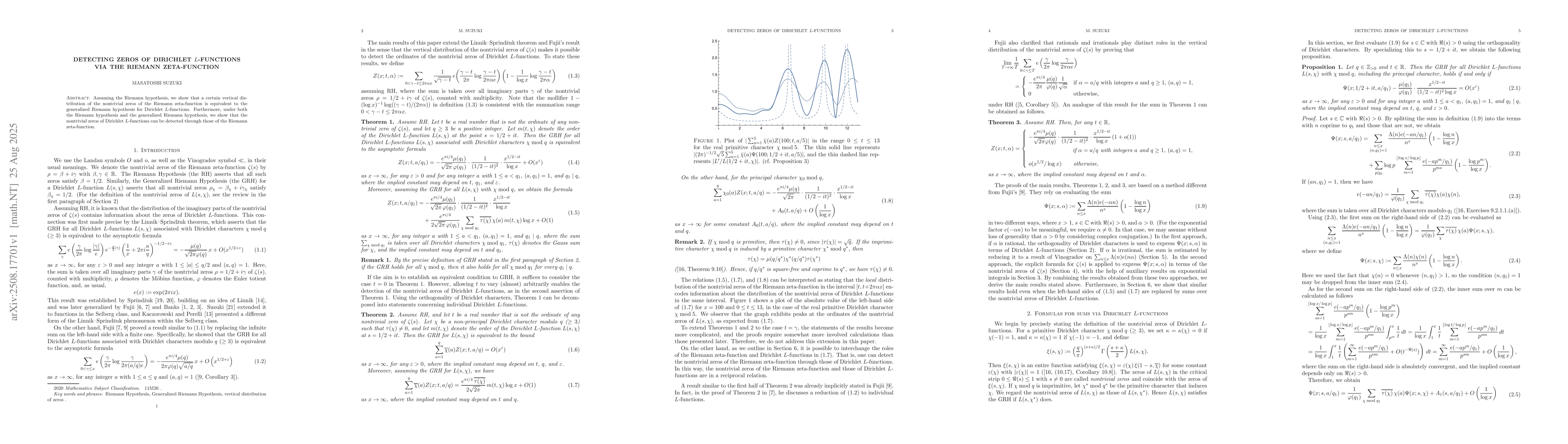 Assuming the Riemann hypothesis, we show that a certain vertical distribution of the nontrivial zeros of the Riemann zeta-function is equivalent to the generalized Riemann hypothesis for Dirichlet $L$-functions. Furthermore, under both the Riemann hypothesis and the generalized Riemann hypothesis, we show that the nontrivial zeros of Dirichlet $L$-functions can be detected through those of the Riemann zeta-function.