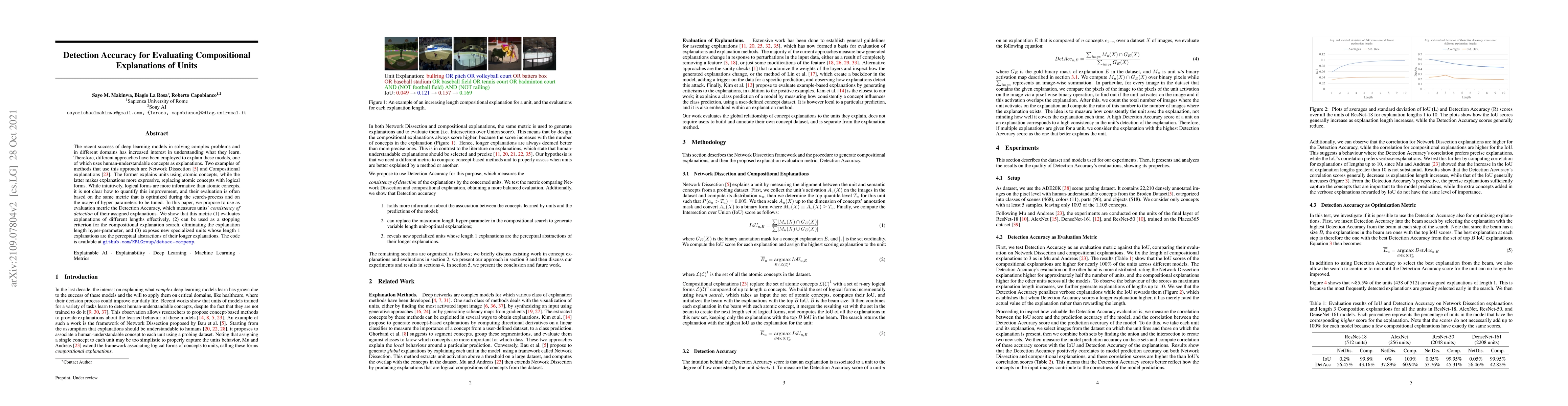 This paper proposes Detection Accuracy as a metric to evaluate the effectiveness of compositional explanations in deep learning models, demonstrating its ability to assess explanations of varying lengths, serve as a stopping criterion for search, and reveal specialized units.