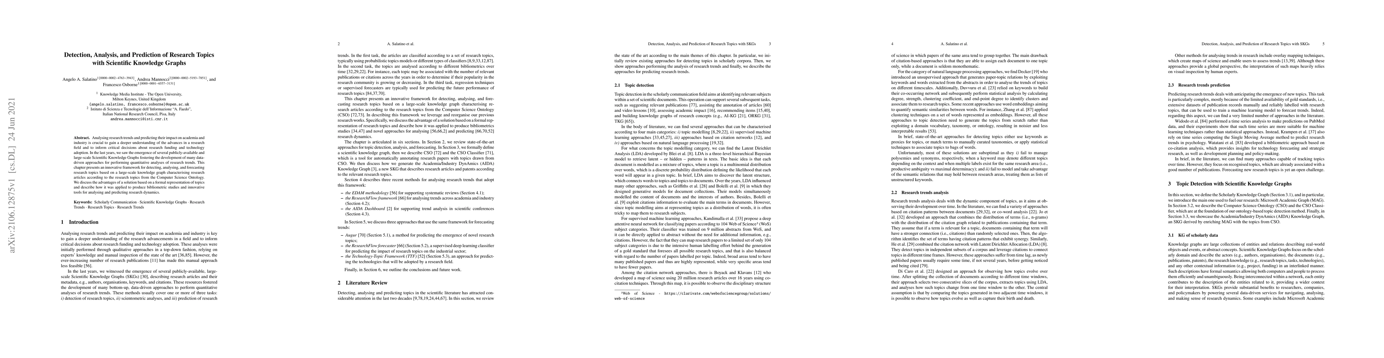 Analysing research trends and predicting their impact on academia and industry is crucial to gain a deeper understanding of the advances in a research field and to inform critical decisions about research funding and technology adoption. In the last years, we saw the emergence of several publicly-available and large-scale Scientific Knowledge Graphs fostering the development of many data-driven approaches for performing quantitative analyses of research trends. This chapter presents an innovative framework for detecting, analysing, and forecasting research topics based on a large-scale knowledge graph characterising research articles according to the research topics from the Computer Science Ontology. We discuss the advantages of a solution based on a formal representation of topics and describe how it was applied to produce bibliometric studies and innovative tools for analysing and predicting research dynamics.