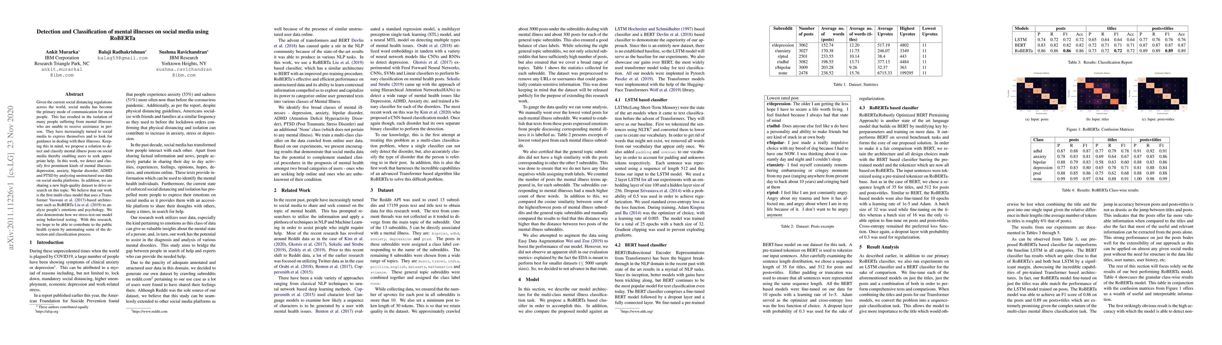 The paper introduces a RoBERTa-based transformer model for mental illness detection and classification, demonstrating its superiority over LSTM and BERT models on a new dataset.