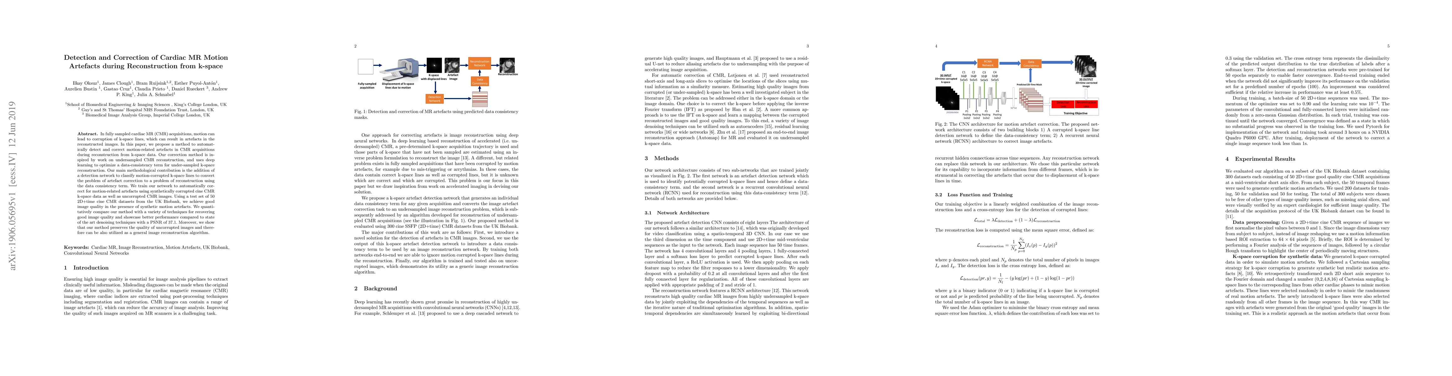 This paper proposes a method to detect and correct motion-related artefacts in cardiac MR images during k-space reconstruction using deep learning. The approach includes a detection network to classify corrupted k-space lines, optimizing a data-consistency term for reconstruction, and demonstrates superior performance compared to state-of-the-art denoising techniques.