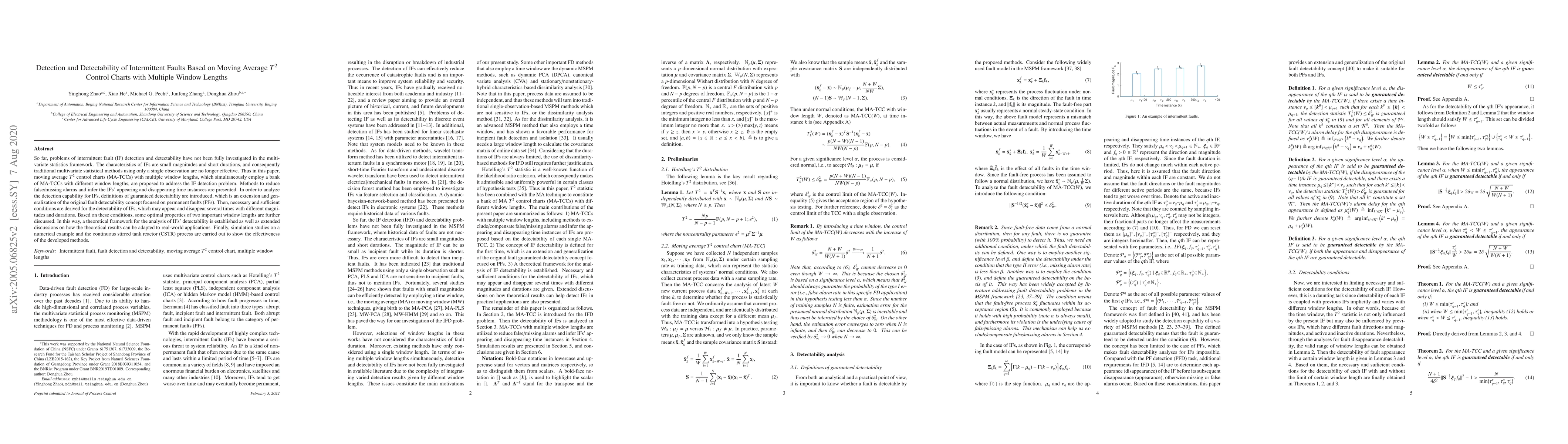 This paper proposes moving average T² control charts with multiple window lengths to detect intermittent faults characterized by small magnitudes and short durations. It introduces guaranteed detectability definitions and derives conditions for IF detectability, discussing optimal window lengths and presenting simulation results to demonstrate the effectiveness of the proposed methods.