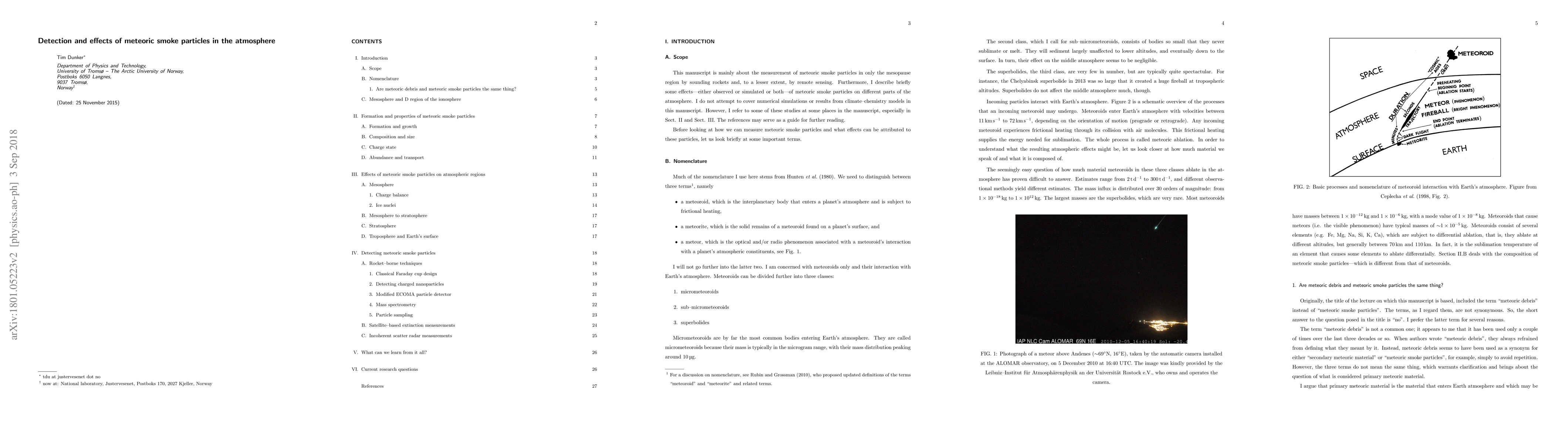 These are the lecture notes of a trial lecture on the given topic "The detection and effects of meteoric debris in the atmosphere and why we should care". I have shortened the title a little, while I have expanded on the contents. First, I discuss some of the relevant nomenclature. Then, I go through the composition, size, formation and abundance of meteoric smoke particles. I describe some effects that meteoric smoke particles have - or are thought to have - on the mesosphere, stratosphere, troposphere, and even the Earth's surface. The major part of this lecture is about the measurements of meteoric smoke particles by instruments on sounding rockets. I rather briefly mention results from satellite and radar observations.