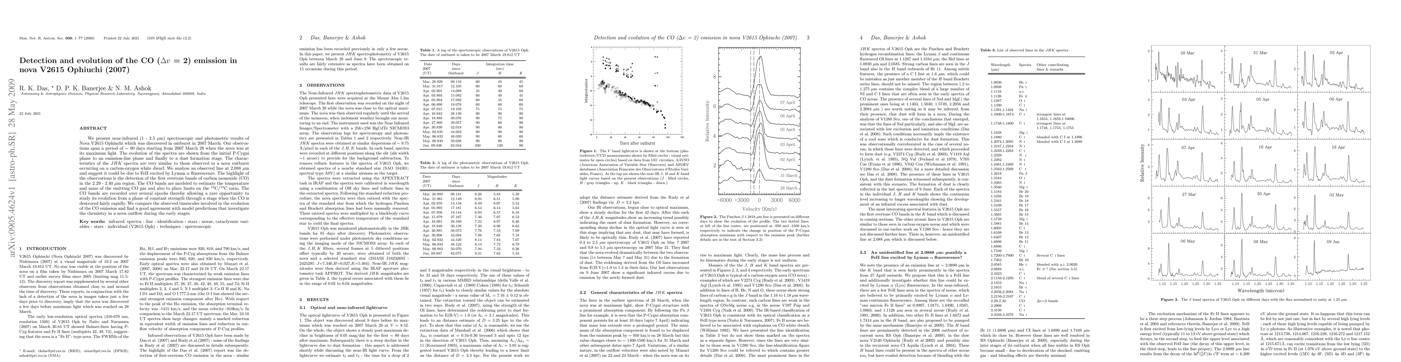 This paper reports on the detection and evolution of CO (v = 2) emission in Nova V2615 Ophiuchi, observed over 80 days starting from maximum light in 2007. The study reveals the transition from P-Cygni to emission-line phase and eventual dust formation, with the first detection of CO's overtone bands in the nova, providing insights into the gas temperature, mass, and 12C/13C ratio.