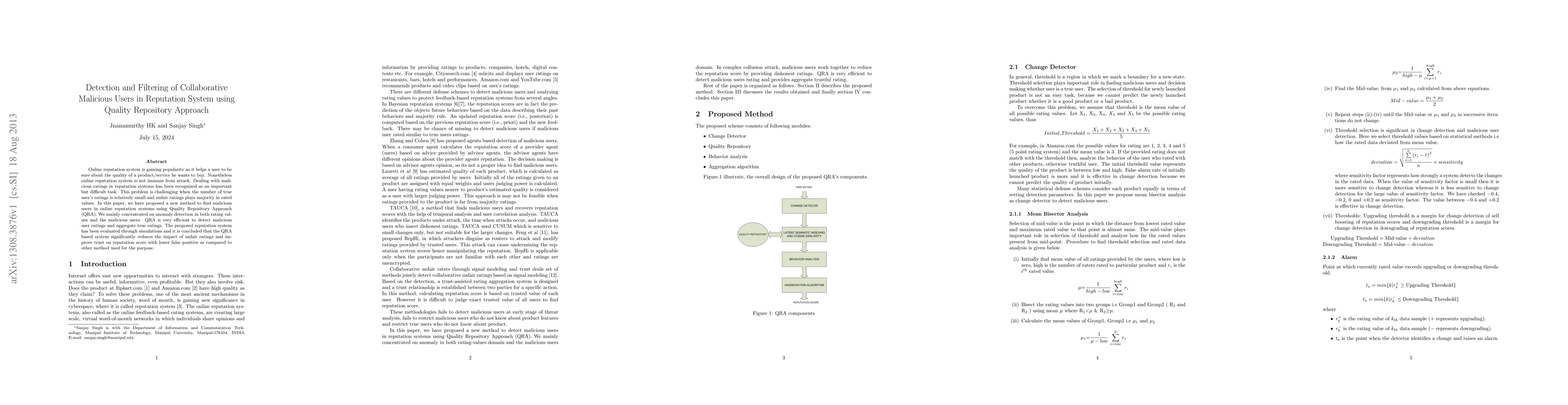 The novelty of this research lies in its use of Quality Repository Approach (QRA) that combines statistical change detection, Latent Semantic Indexing (LSI), and cosine similarity for dynamic creation and maintenance of a Quality Repository, enabling efficient detection of collaborative malicious users in reputation systems.