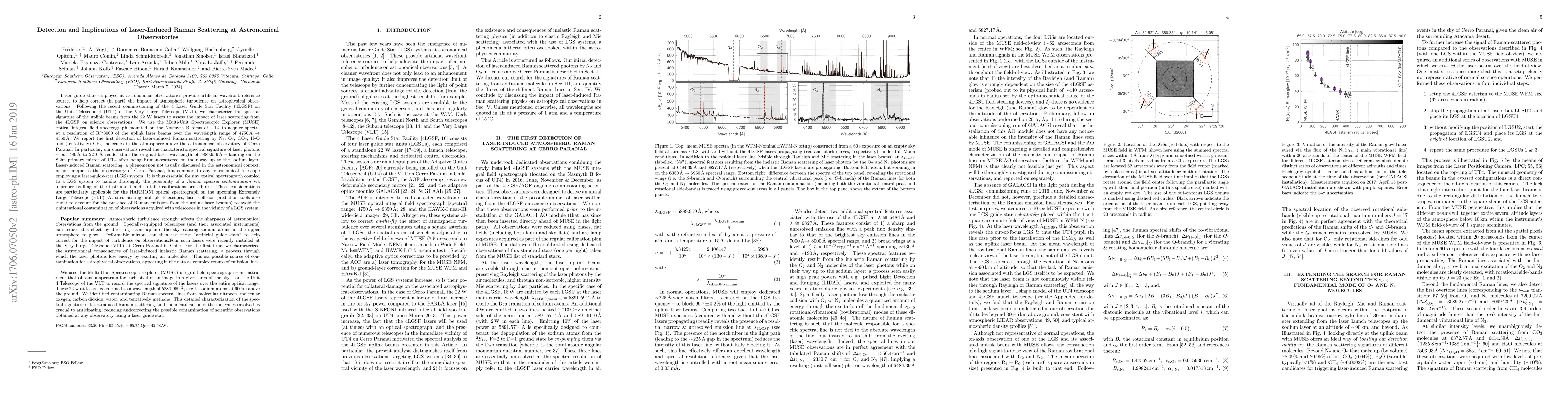 (Abr.) Laser guide stars employed at astronomical observatories provide artificial wavefront reference sources to help correct (in part) the impact of atmospheric turbulence on astrophysical observations. Following the recent commissioning of the 4 Laser Guide Star Facility (4LGSF) on UT4 at the VLT, we characterize the spectral signature of the uplink beams from the 22W lasers to assess the impact of laser scattering from the 4LGSF on science observations. We use the MUSE optical integral field spectrograph to acquire spectra at a resolution of R~3000 of the uplink laser beams over the wavelength range of 4750\AA\ to 9350\AA. We report the first detection of laser-induced Raman scattering by N2, O2, CO2, H2O and (tentatively) CH4 molecules in the atmosphere above the astronomical observatory of Cerro Paranal. In particular, our observations reveal the characteristic spectral signature of laser photons -- but 480\AA\ to 2210\AA\ redder than the original laser wavelength of 5889.959\AA\ -- landing on the 8.2m primary mirror of UT4 after being Raman-scattered on their way up to the sodium layer. Laser-induced Raman scattering is not unique to the observatory of Cerro Paranal, but common to any astronomical telescope employing a laser-guide-star (LGS) system. It is thus essential for any optical spectrograph coupled to a LGS system to handle thoroughly the possibility of a Raman spectral contamination via a proper baffling of the instrument and suitable calibrations procedures. These considerations are particularly applicable for the HARMONI optical spectrograph on the upcoming Extremely Large Telescope. At sites hosting multiple telescopes, laser collision prediction tools also ought to account for the presence of Raman emission from the uplink laser beam(s) to avoid the unintentional contamination of observations acquired with telescopes in the vicinity of a LGS system.