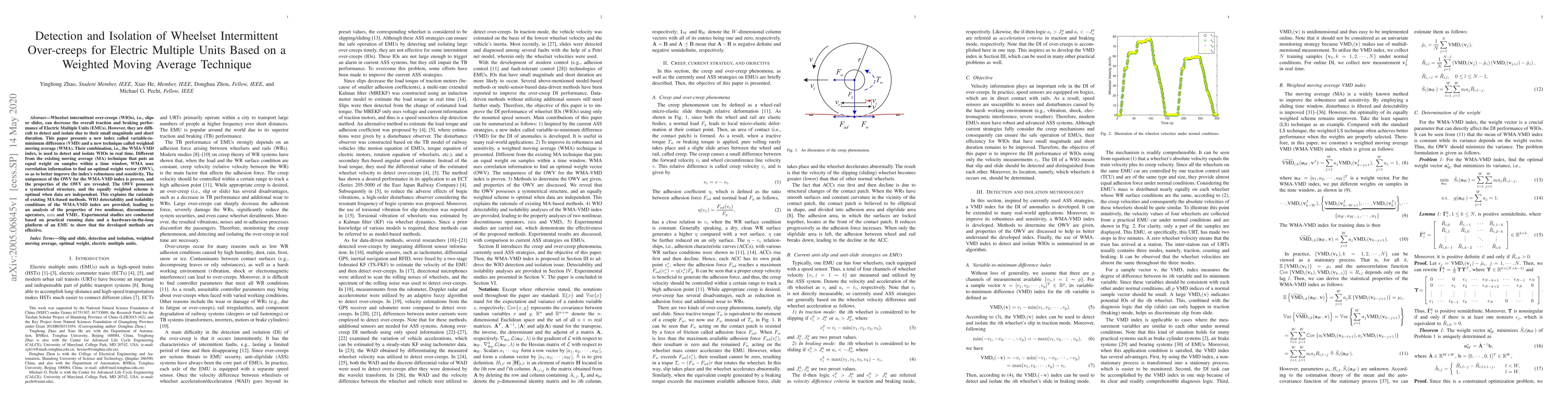 This paper presents a new method combining a variable-to-minimum difference index (VMD) and a weighted moving average technique (WMA) to detect and isolate wheelset intermittent over-creeps (WIOs) in Electric Multiple Units (EMUs). The WMA-VMD index uses an optimal weight vector (OWV) to enhance robustness and sensitivity, proving its effectiveness through practical experiments.