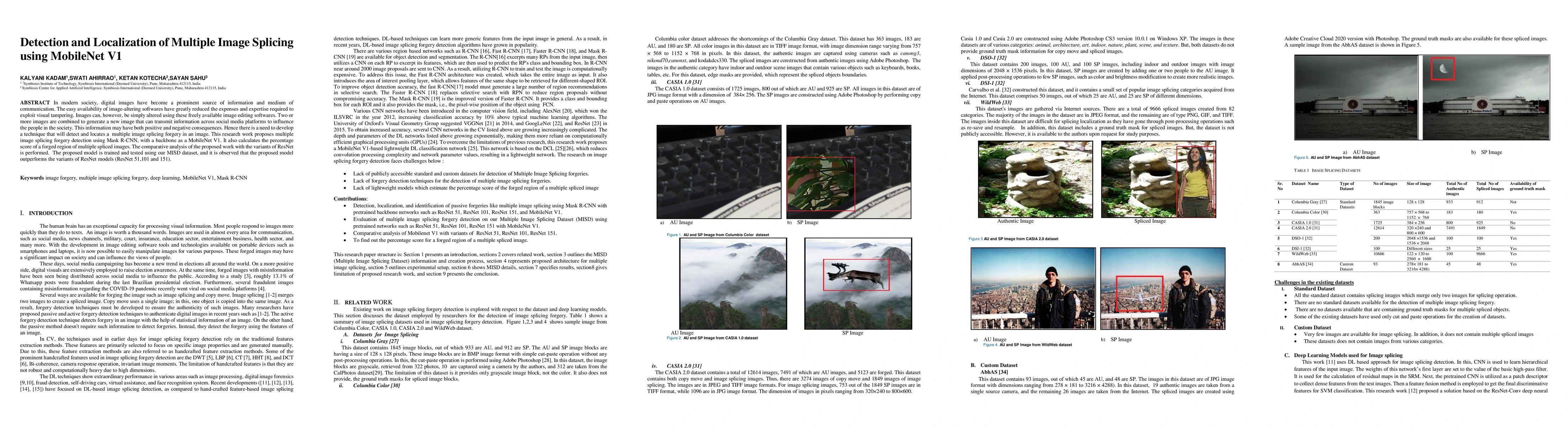 This paper proposes a technique for detecting and localizing multiple image splicing using Mask R-CNN with MobileNet V1 as its backbone. The model outperforms variants of ResNet in detecting forged regions, as demonstrated through comparative analysis using the MISD dataset.