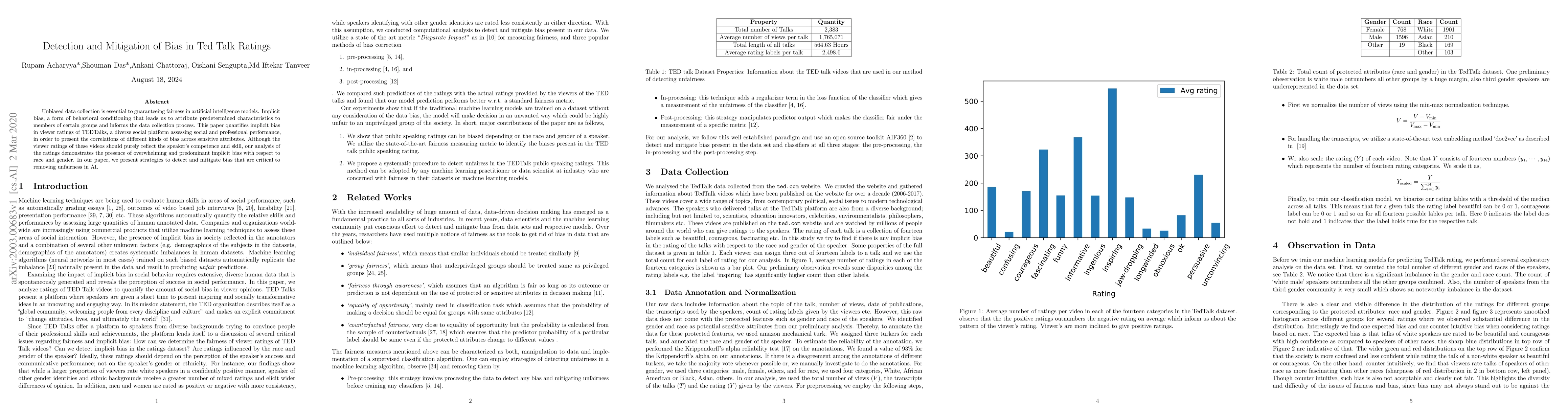 Unbiased data collection is essential to guaranteeing fairness in artificial intelligence models. Implicit bias, a form of behavioral conditioning that leads us to attribute predetermined characteristics to members of certain groups and informs the data collection process. This paper quantifies implicit bias in viewer ratings of TEDTalks, a diverse social platform assessing social and professional performance, in order to present the correlations of different kinds of bias across sensitive attributes. Although the viewer ratings of these videos should purely reflect the speaker's competence and skill, our analysis of the ratings demonstrates the presence of overwhelming and predominant implicit bias with respect to race and gender. In our paper, we present strategies to detect and mitigate bias that are critical to removing unfairness in AI.