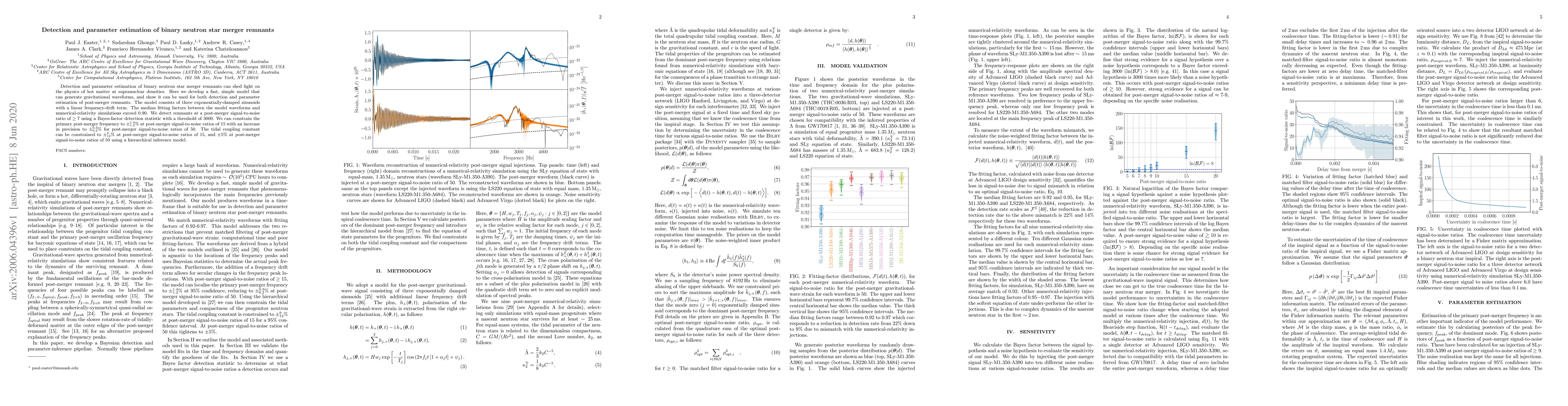 This paper develops a simple model for detecting and estimating parameters of binary neutron star merger remnants using gravitational waveforms, achieving high fitting factors and precise parameter constraints. The model employs three exponentially-damped sinusoids and can detect remnants at a signal-to-noise ratio of 7 or higher.