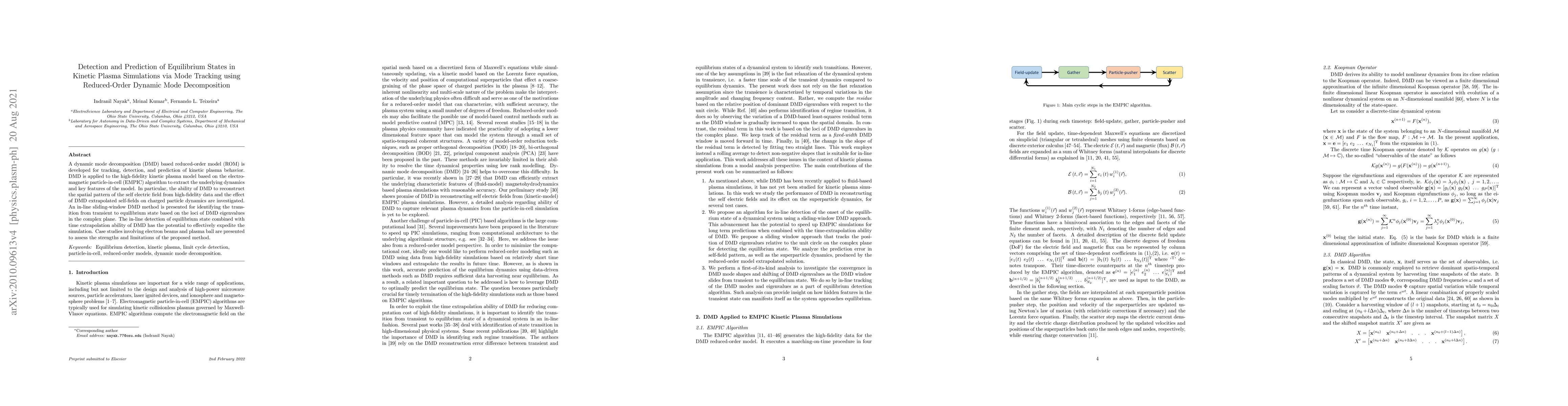 This paper develops a reduced-order model using dynamic mode decomposition (DMD) to track, detect, and predict equilibrium states in kinetic plasma simulations. The method, applied to high-fidelity electromagnetic particle-in-cell (EMPIC) models, enables the reconstruction of self-electric fields and aids in identifying transitions to equilibrium states.