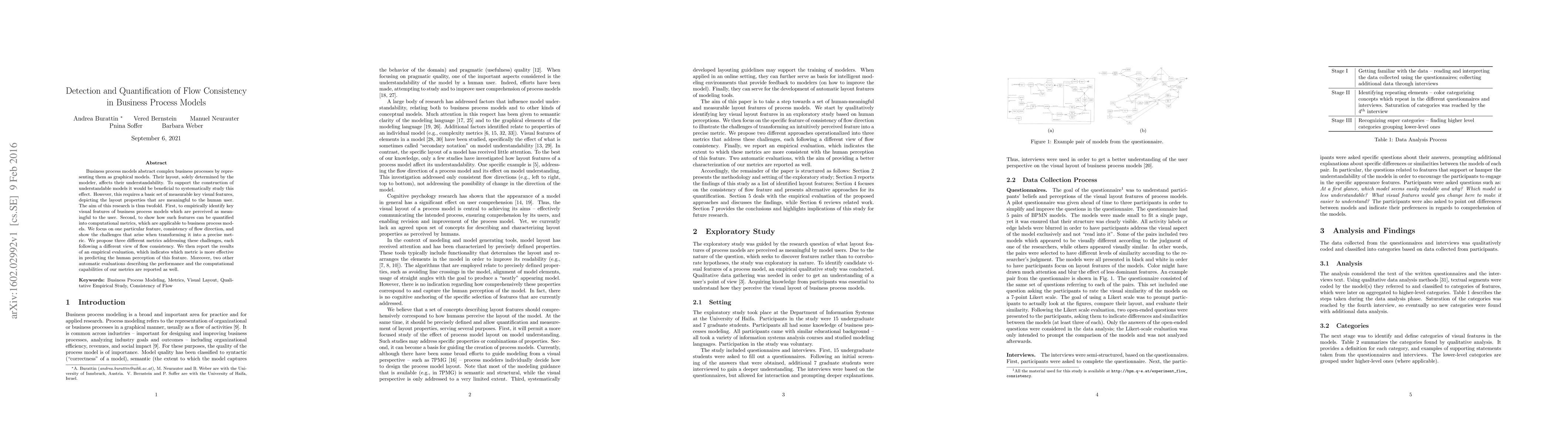 Researchers investigated how layout affects understandability of business process models and proposed three metrics to quantify flow consistency, finding that one metric best predicts human perception.