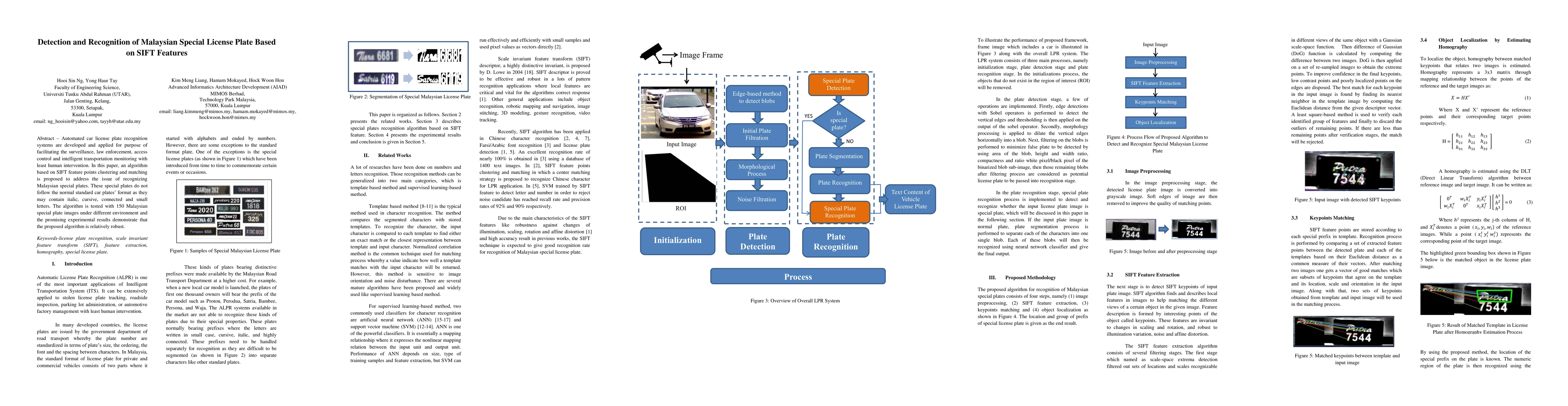 Automated car license plate recognition systems are developed and applied for purpose of facilitating the surveillance, law enforcement, access control and intelligent transportation monitoring with least human intervention. In this paper, an algorithm based on SIFT feature points clustering and matching is proposed to address the issue of recognizing Malaysian special plates. These special plates do not follow the format of standard car plates as they may contain italic, cursive, connected and small letters. The algorithm is tested with 150 Malaysian special plate images under different environment and the promising experimental results demonstrate that the proposed algorithm is relatively robust.