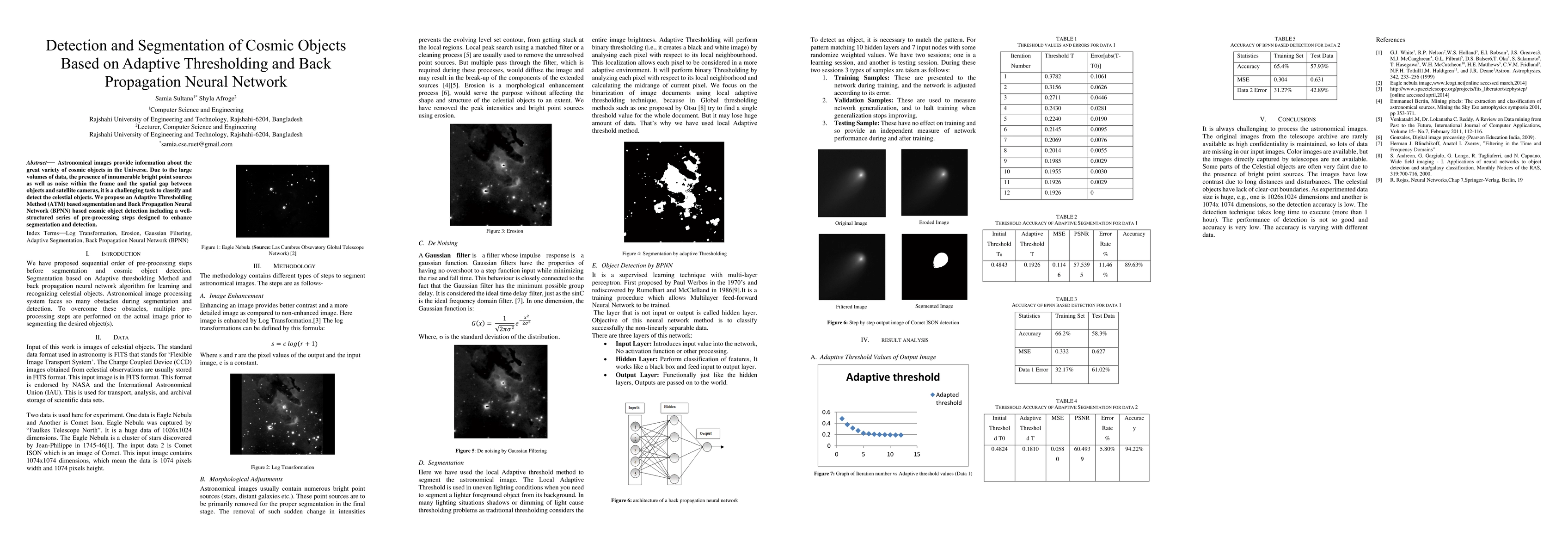 This paper proposes an Adaptive Thresholding Method (ATM) for segmenting cosmic objects and a Back Propagation Neural Network (BPNN) for their detection, addressing the challenges posed by astronomical images' large data volumes, bright point sources, noise, and spatial gaps. The method integrates a series of pre-processing steps to improve segmentation and detection accuracy.
