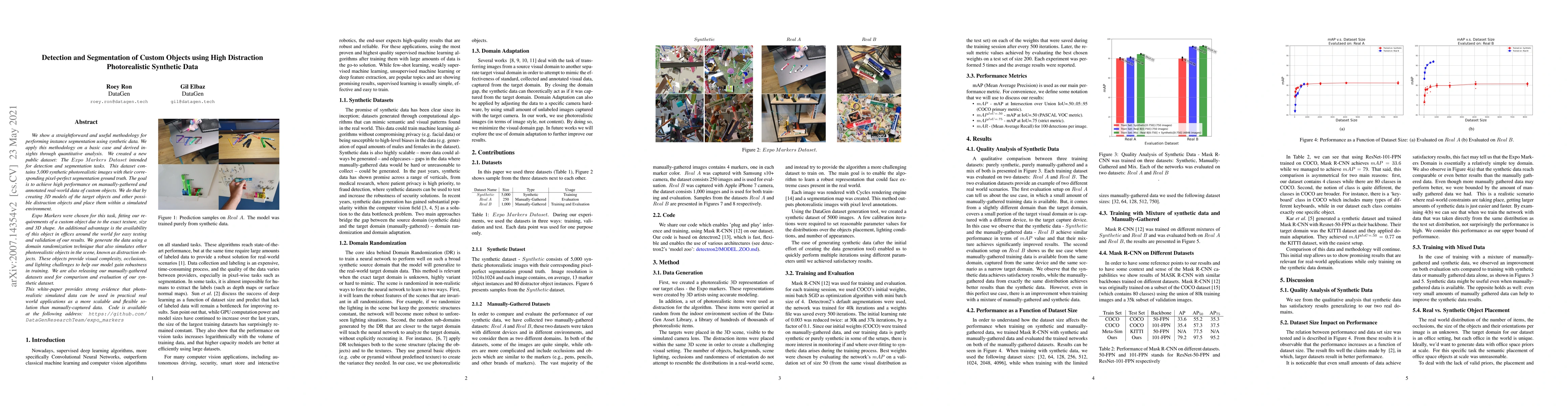 This paper presents a methodology for instance segmentation using high distraction photorealistic synthetic data, introducing the Expo Markers Dataset with 5,000 images for training. The synthetic data, generated with domain randomization, includes custom Expo Markers and various distraction objects to enhance model robustness.