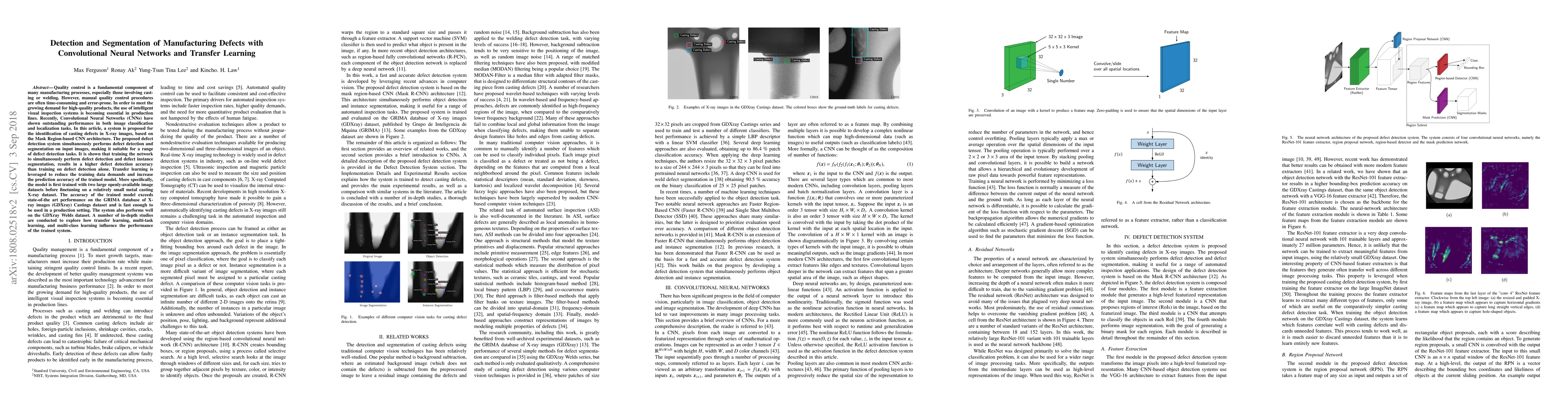 Quality control is a fundamental component of many manufacturing processes, especially those involving casting or welding. However, manual quality control procedures are often time-consuming and error-prone. In order to meet the growing demand for high-quality products, the use of intelligent visual inspection systems is becoming essential in production lines. Recently, Convolutional Neural Networks (CNNs) have shown outstanding performance in both image classification and localization tasks. In this article, a system is proposed for the identification of casting defects in X-ray images, based on the Mask Region-based CNN architecture. The proposed defect detection system simultaneously performs defect detection and segmentation on input images, making it suitable for a range of defect detection tasks. It is shown that training the network to simultaneously perform defect detection and defect instance segmentation, results in a higher defect detection accuracy than training on defect detection alone. Transfer learning is leveraged to reduce the training data demands and increase the prediction accuracy of the trained model. More specifically, the model is first trained with two large openly-available image datasets before finetuning on a relatively small metal casting X-ray dataset. The accuracy of the trained model exceeds state-of-the art performance on the GRIMA database of X-ray images (GDXray) Castings dataset and is fast enough to be used in a production setting. The system also performs well on the GDXray Welds dataset. A number of in-depth studies are conducted to explore how transfer learning, multi-task learning, and multi-class learning influence the performance of the trained system.