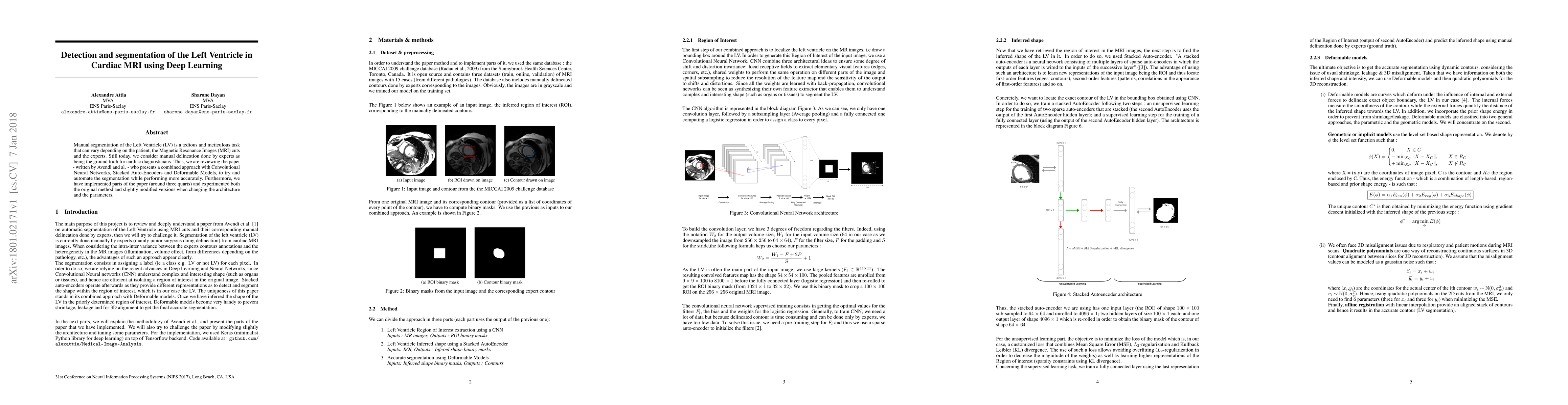 This paper by Avendi et al. proposes a deep learning method combining Convolutional Neural Networks, Stacked Auto-Encoders, and Deformable Models to automate the segmentation of the Left Ventricle in cardiac MRI, aiming for accuracy comparable to expert manual delineation. The authors also implemented and tested modified versions of the original method to optimize performance.