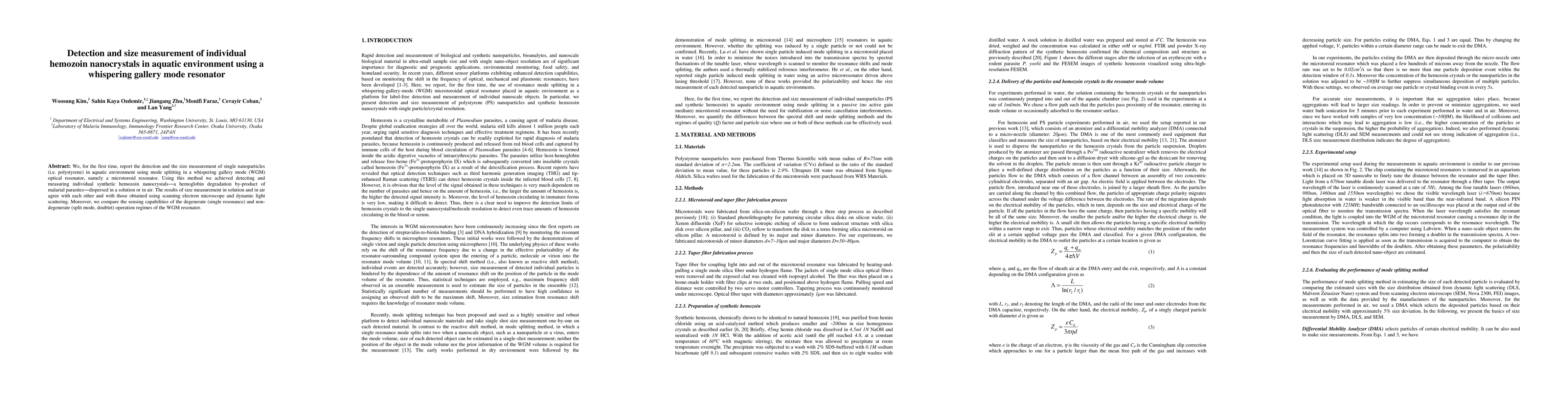 We, for the first time, report the detection and the size measurement of single nanoparticles (i.e. polystyrene) in aquatic environment using mode splitting in a whispering gallery mode (WGM) optical resonator, namely a microtoroid resonator. Using this method we achieved detecting and measuring individual synthetic hemozoin nanocrystals, which are a hemoglobin degradation by-product of malarial parasites, dispersed in a solution or in air. The results of size measurement in solution and in air agree with each other and with those obtained using scanning electron microscope and dynamic light scattering. Moreover, we compare the sensing capabilities of the degenerate (single resonance) and non-degenerate (split mode, doublet) operation regimes of the WGM resonator.