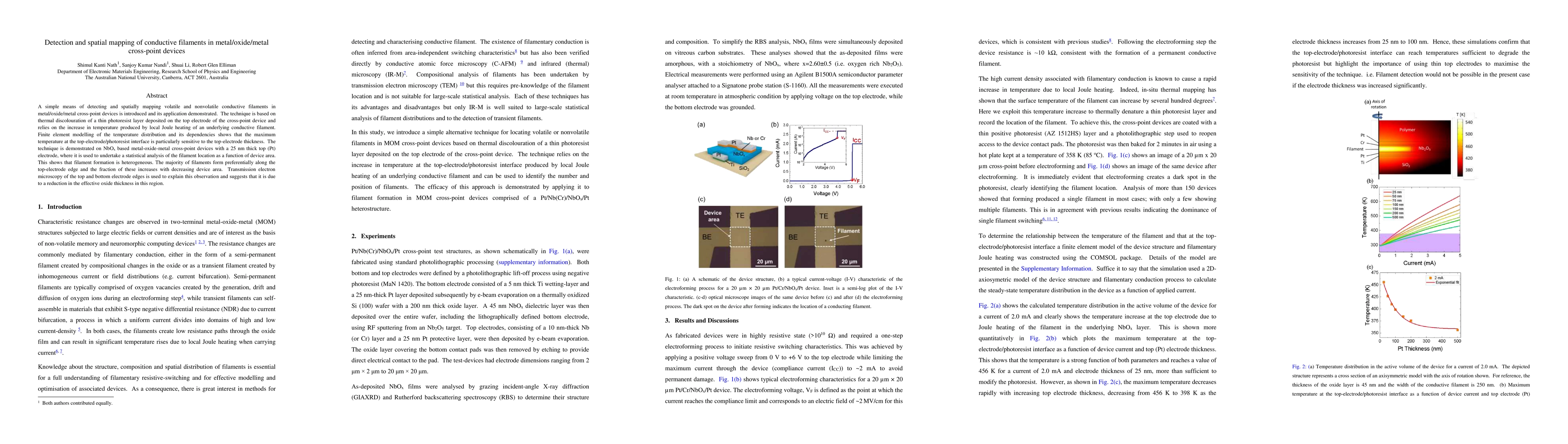This paper introduces a method for detecting and mapping conductive filaments in metal/oxide/metal cross-point devices using thermal discoloration of a photoresist layer, revealing that filament formation is heterogeneous and predominantly occurs along the top-electrode edge, especially in smaller devices.