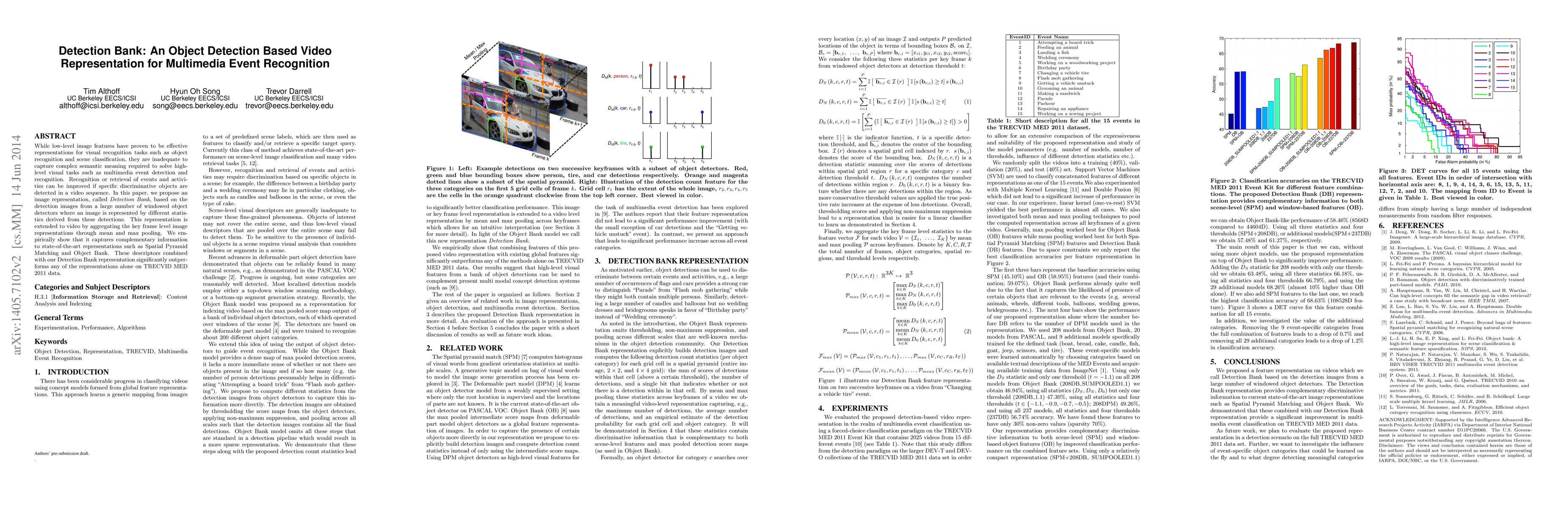 The paper proposes a Detection Bank representation based on object detections from windowed detectors to enhance multimedia event recognition. This video representation aggregates key frame-level detections through mean and max pooling, outperforming state-of-the-art methods on TRECVID MED 2011 data when combined with other descriptors.