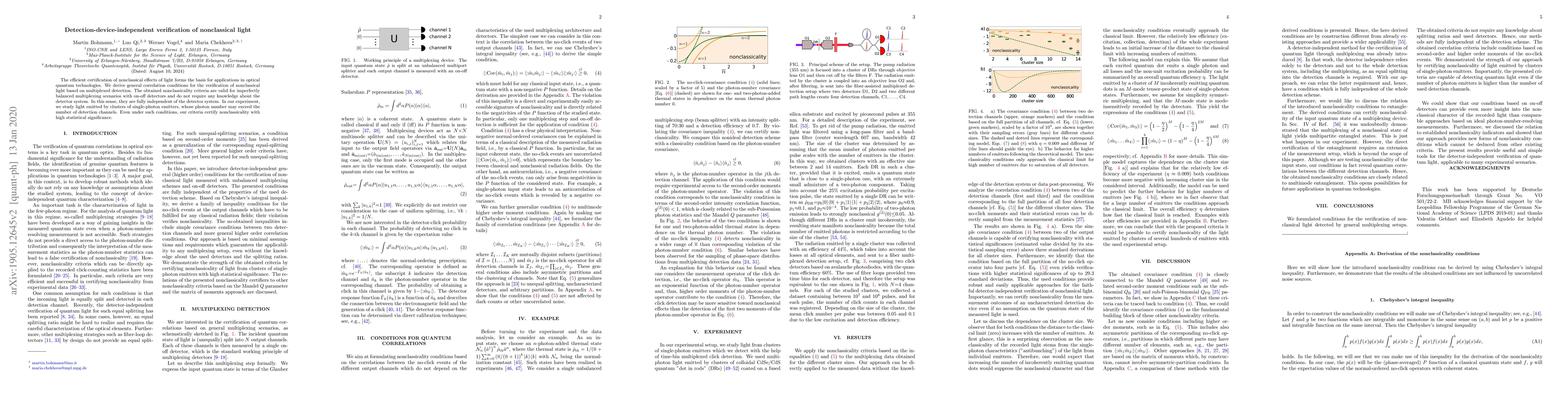 This paper proposes general criteria for detecting nonclassical light effects using multiplexed detection, which are valid even with imperfectly-balanced setups and on-off detectors. The criteria are detection-device-independent, ensuring certification of nonclassicality without needing detailed knowledge of the detector system, and are validated experimentally with clusters of single-photon emitters.