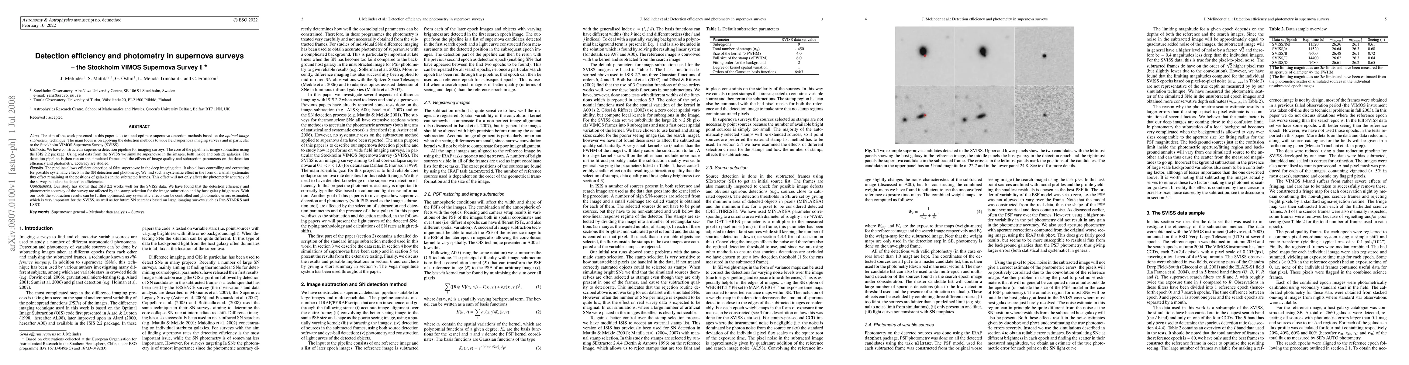 The aim of the work presented in this paper is to test and optimise supernova detection methods based on the optimal image subtraction technique. The main focus is on applying the detection methods to wide field supernova imaging surveys and in particular to the Stockholm VIMOS Supernova Survey (SVISS). We have constructed a supernova detection pipeline for imaging surveys. The core of the pipeline is image subtraction using the ISIS 2.2 package. Using real data from the SVISS we simulate supernovae in the images, both inside and outside galaxies. The detection pipeline is then run on the simulated frames and the effects of image quality and subtraction parameters on the detection efficiency and photometric accuracy are studied. The pipeline allows efficient detection of faint supernovae in the deep imaging data. It also allows controlling and correcting for possible systematic effects in the SN detection and photometry. We find such a systematic effect in the form of a small systematic flux offset remaining at the positions of galaxies in the subtracted frames. This offset will not only affect the photometric accuracy of the survey, but also the detection efficiencies. Our study has shown that ISIS 2.2 works well for the SVISS data. We have found that the detection efficiency and photometric accuracy of the survey are affected by the stamp selection for the image subtraction and by host galaxy brightness. With our tools the subtraction results can be further optimised, any systematic effects can be controlled and photometric errors estimated, which is very important for the SVISS, as well as for future SN searches based on large imaging surveys such as Pan-STARRS and LSST.