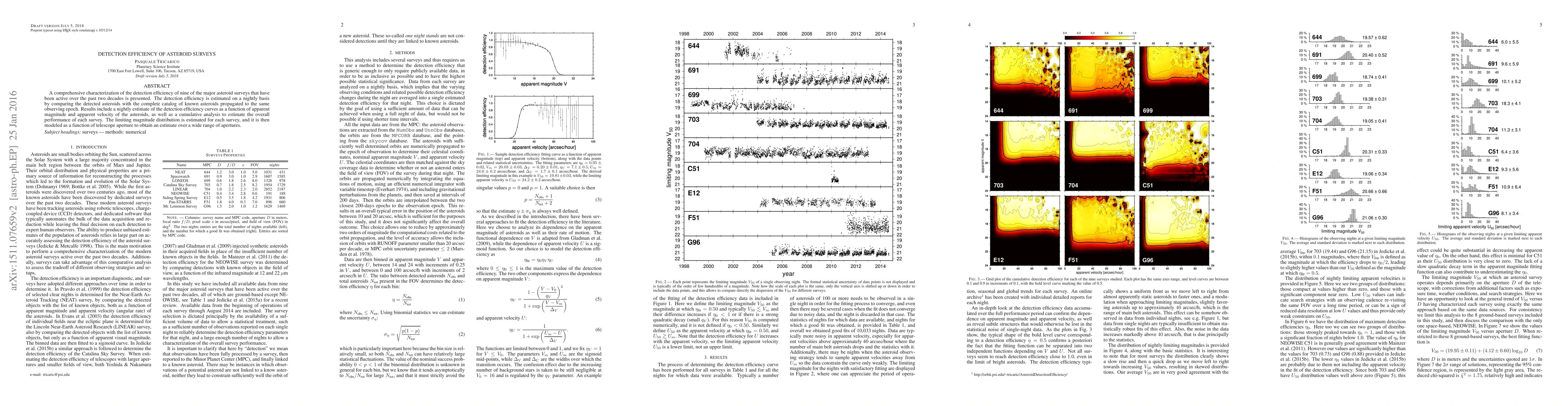 This paper evaluates the detection efficiency of nine major asteroid surveys over two decades, revealing improvements in detection performance with larger telescope apertures.