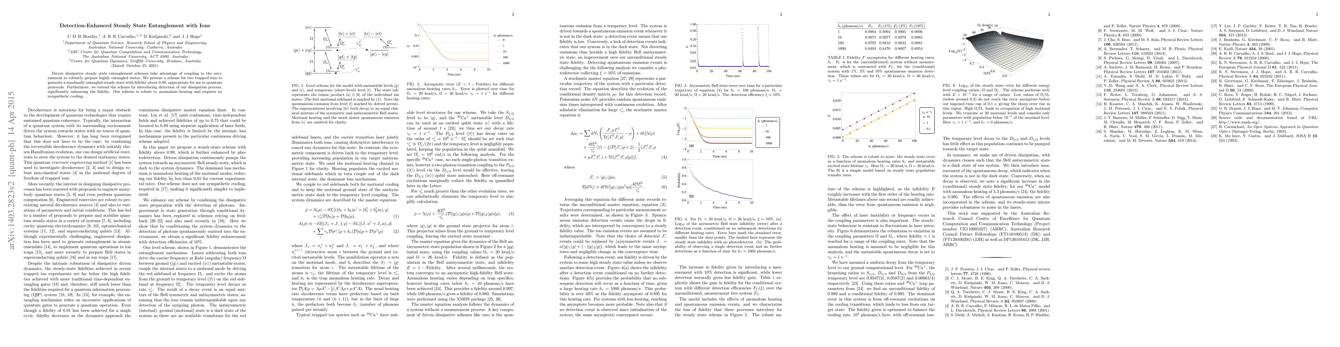 Driven dissipative steady state entanglement schemes take advantage of coupling to the environment to robustly prepare highly entangled states. We present a scheme for two trapped ions to generate a maximally entangled steady state with fidelity above 0.99, appropriate for use in quantum protocols. Furthermore, we extend the scheme by introducing detection of our dissipation process, significantly enhancing the fidelity. Our scheme is robust to anomalous heating and requires no sympathetic cooling.